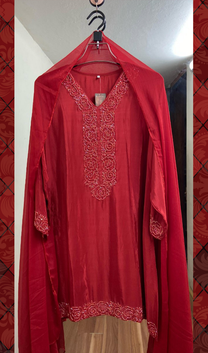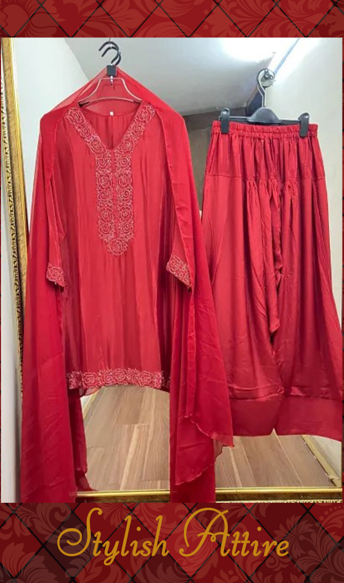 Luxury Russian Silk Pakistani Stitched Farshi Salwar 3 Pcs, Silk Shirt With Pipe Work, Pipe Work Borders On Sleeves, Silk Dupatta & Silk Farshi Salwar.