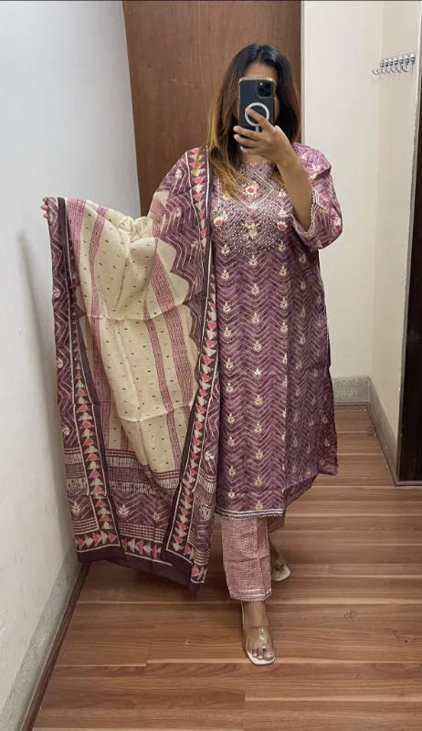 Original Delhi Boutique Stitched 3pcs, Printed & Embroidered Shirt With Pipework, Parl, Stone & Silk Printed Dupatta & Printed Borders On Sleeves & Silk Pant