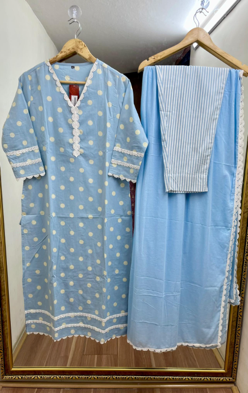Original Indian Jaipuri Stitched 3pcs, Printed Shirt With Lace Work & Cotton Dupatta & Embroidered Borders On Sleeves & Cotton Pant