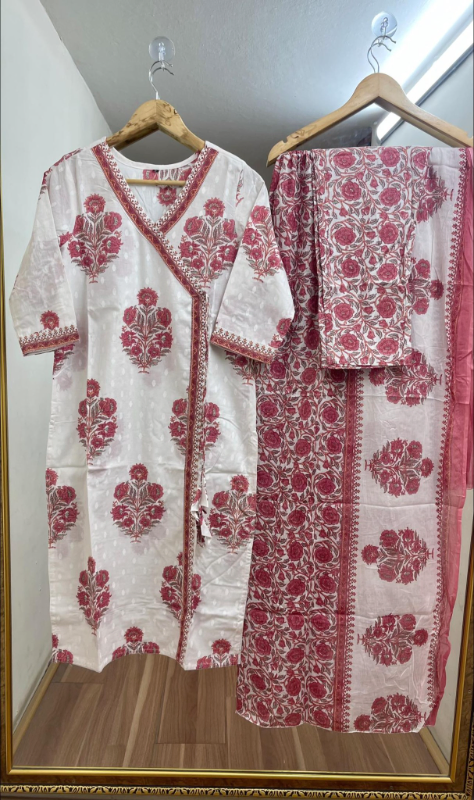 Original Indian Jaipuri Stitched 3pcs, Printed Shirt With Tassel & Printed Cotton Dupatta & Embroidered Borders On Sleeves & Cotton Pant