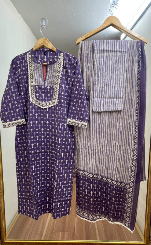 Original Indian Jaipuri Stitched 3pcs, Printed Shirt With Lace Work, Sequin & Printed Cotton Dupatta & Embroidered Borders On Sleeves & Cotton Pant