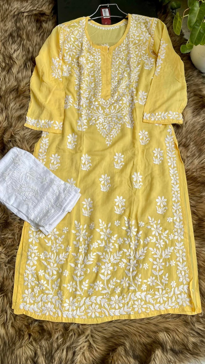 Original Lakhno Stitched Modal Cotton -2 Pcs, Full Hand Embroidered Shirt With & Embroidered Borders On Sleeves & Cotton Pant