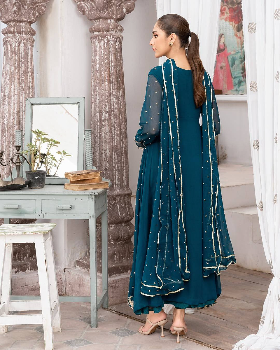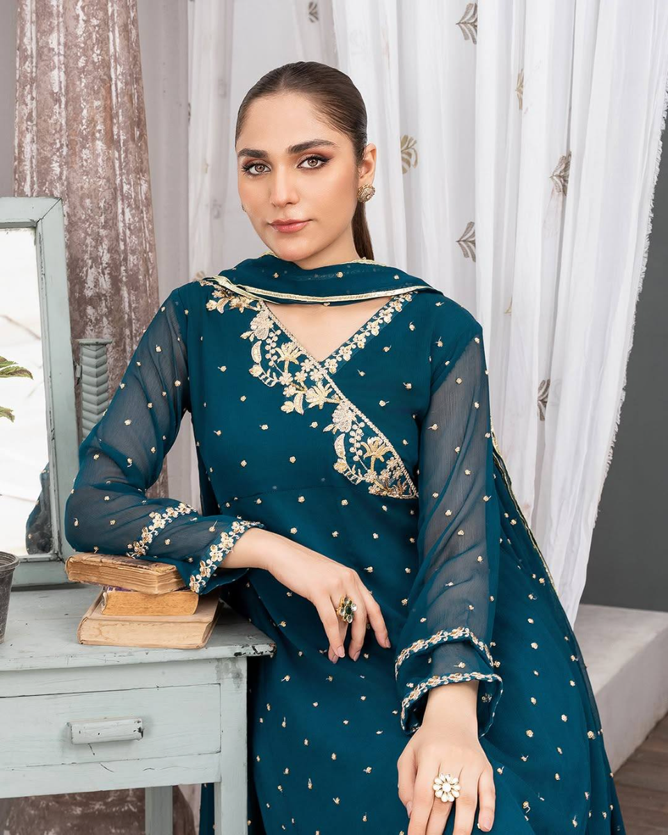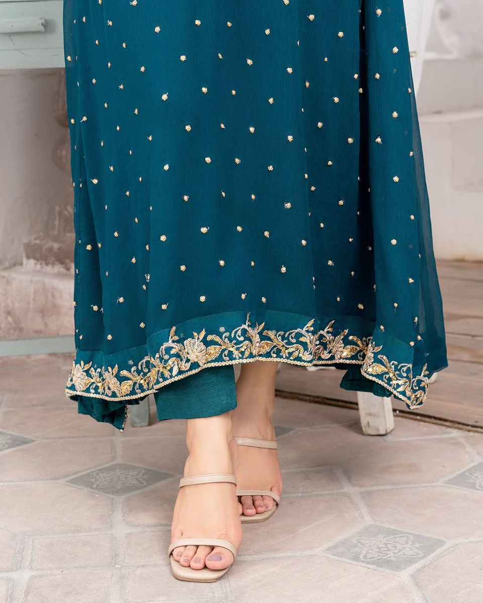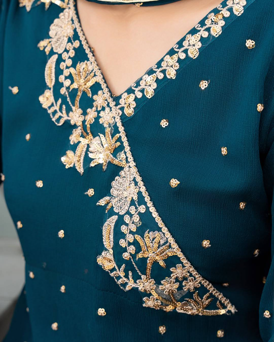 Original Pakistani Angrakha Pishwas Style Stitched 3Pcs By Aghajaan With Embroidered Shirt With Sequined Work & Embroidered Chiffon Dupatta & Embroidered Borders On Sleeve & Silk Pant