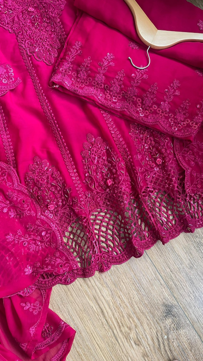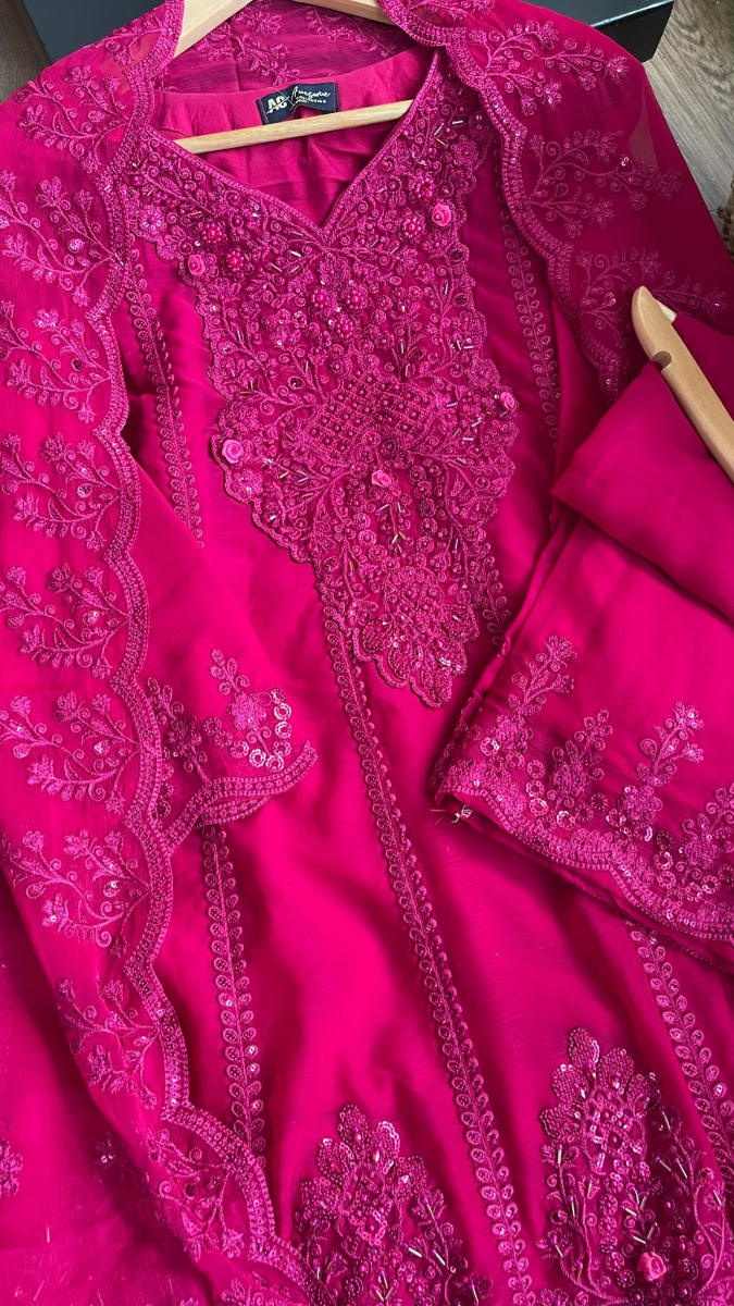 Original Pakistani Chiffon Stitched Frock With Palazzo Set, With Embroidered Shirt With Pipework, Stone work, Parl, Sequne Work & Embroidered Chiffon Dupatta & Embroidered Borders On Sleeve Sequne Work & Chiffon Palazzo Pant