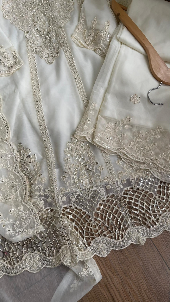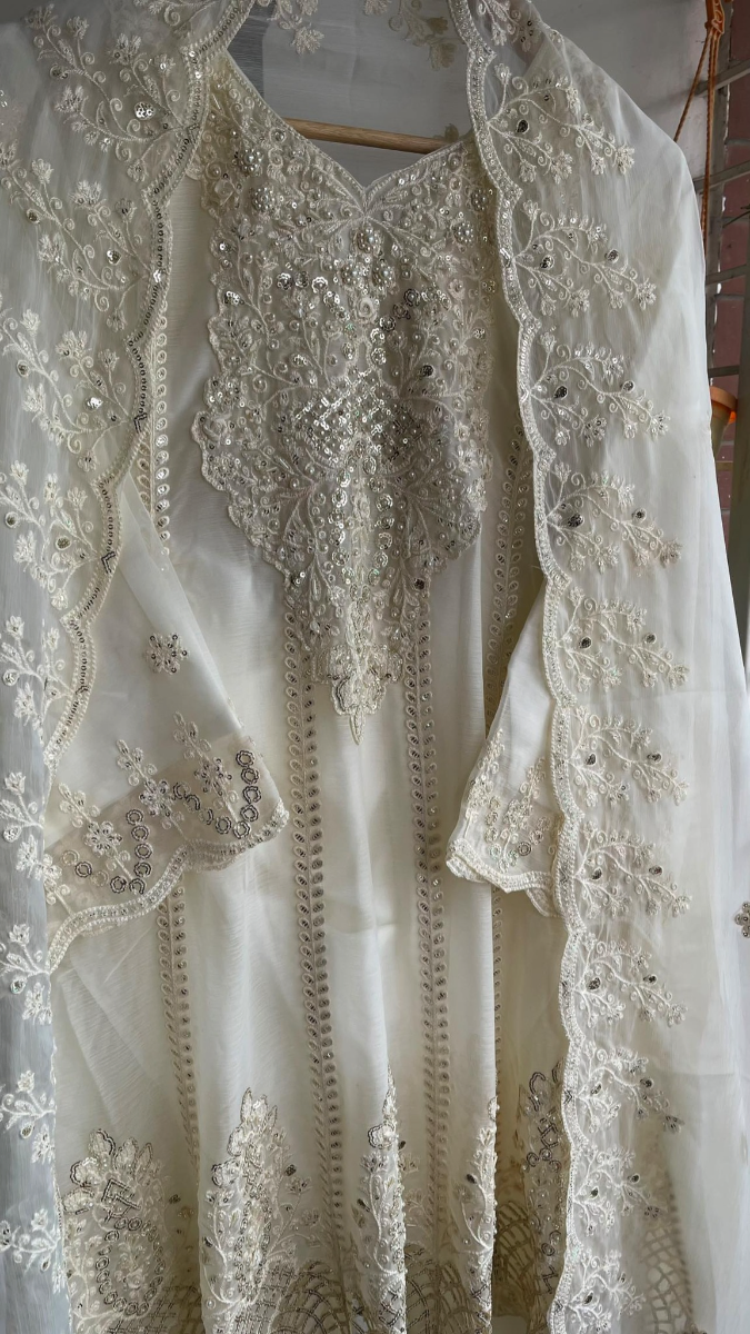 Original Pakistani Chiffon Stitched Frock With Palazzo Set, With Embroidered Shirt With Pipework, Stone work, Parl, Sequne Work & Embroidered Chiffon Dupatta & Embroidered Borders On Sleeve Sequne Work & Chiffon Palazzo Pant