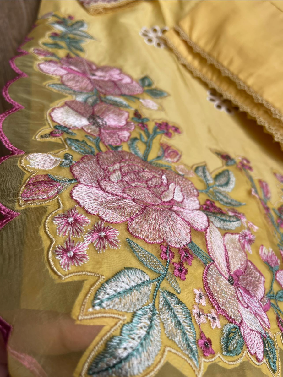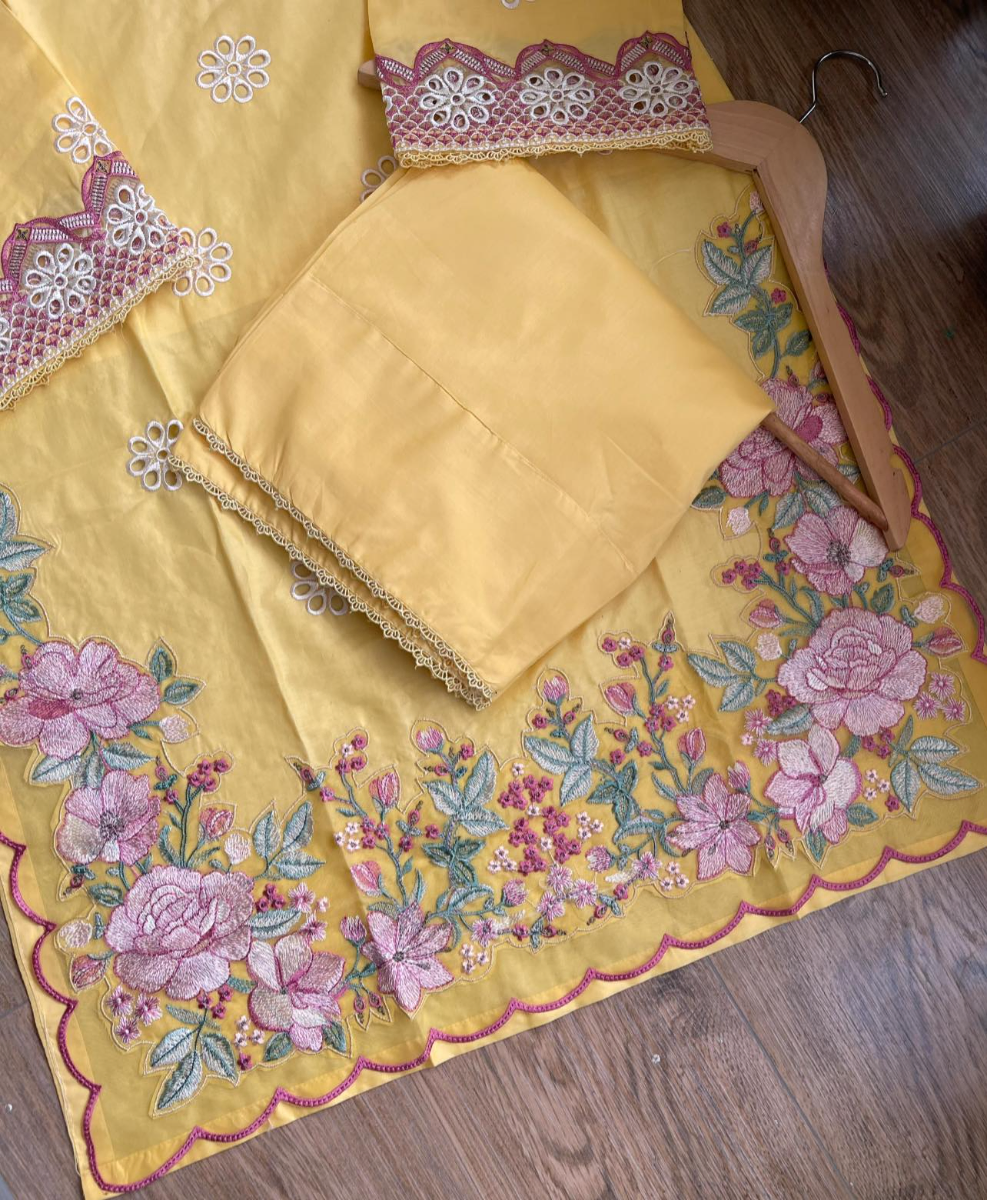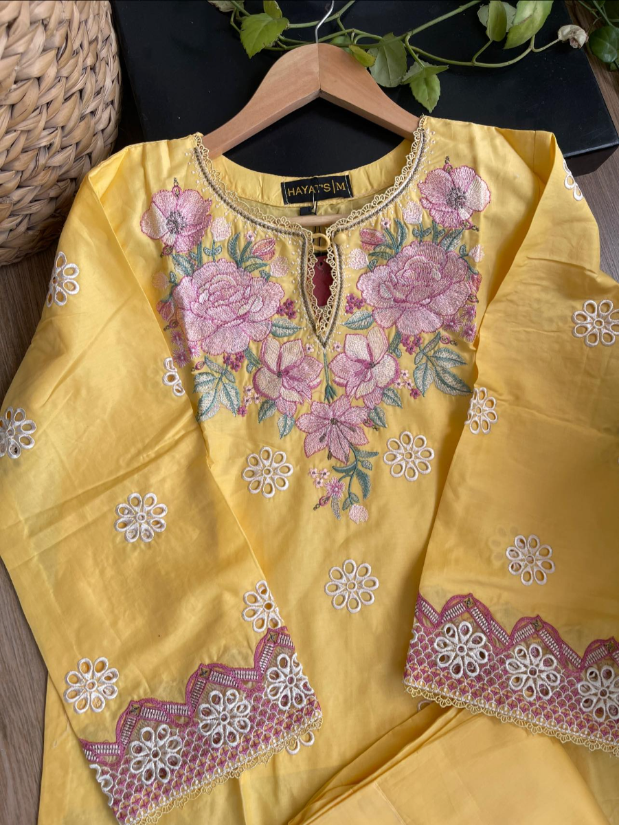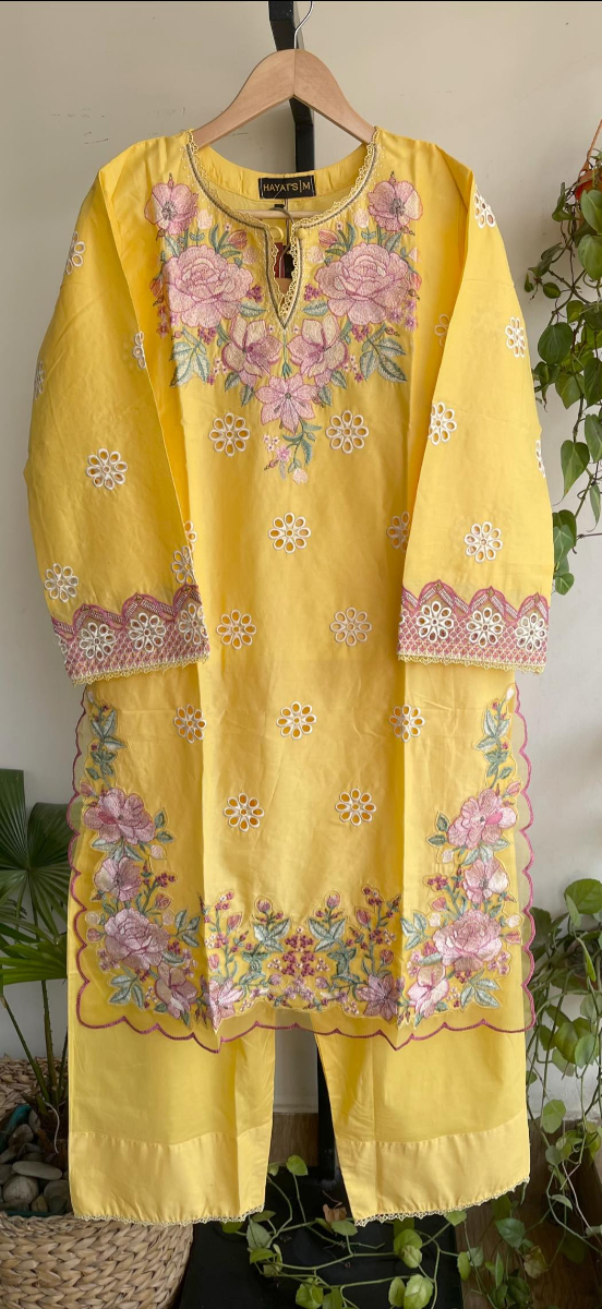 Original Pakistani Hayat’s Cotton Chikankari Embroidered Stitched 2Pc With Inner Attached, Embroidered Shirt With Chikankari Work, Lacework & Embroidered Work Borders On Sleeves & Cotton Pant