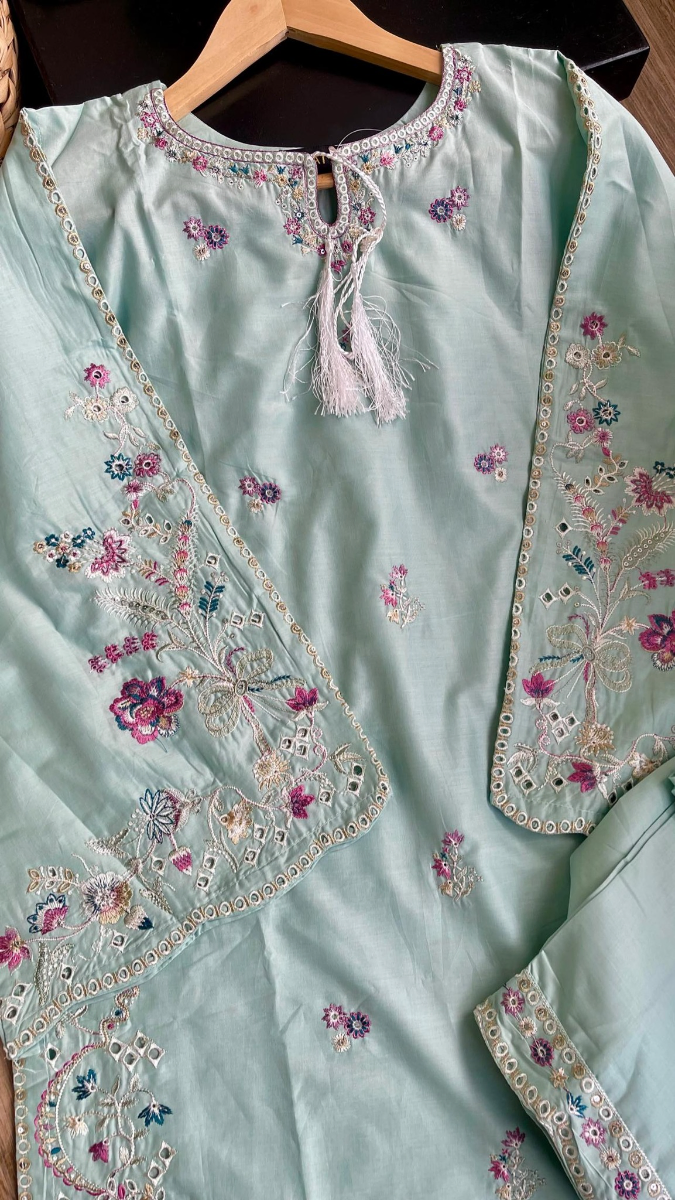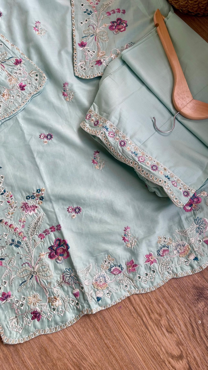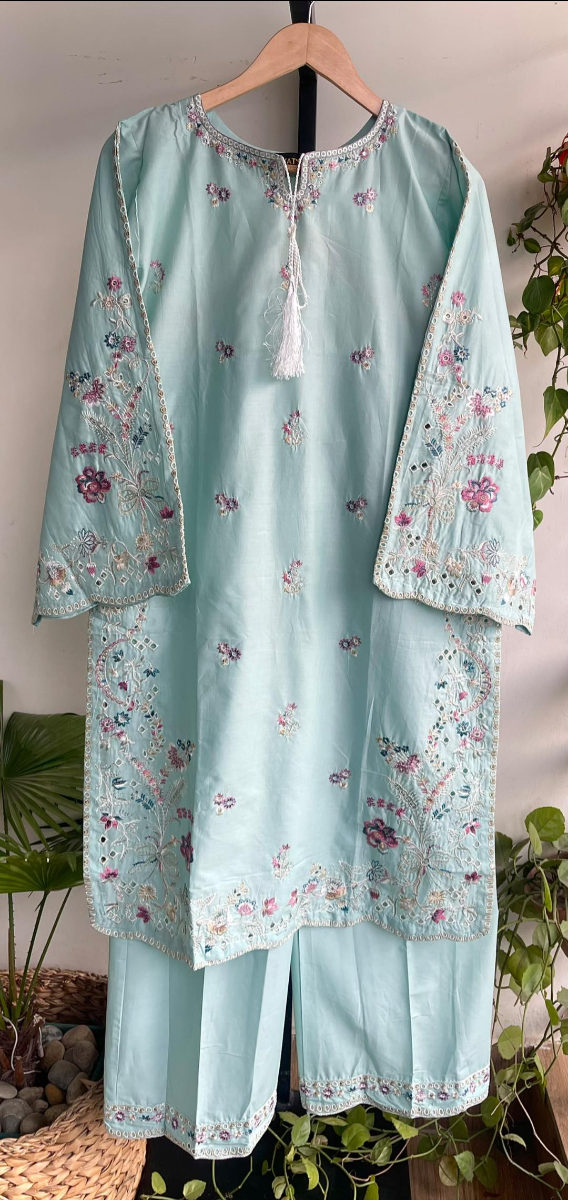 Original Pakistani Hayat’s Cotton Embroidered Stitched 2Pcs, Embroidered Shirt With Sequin Work & Tassel & Full Embroidered Work Borders On Sleeves & Cotton Pant