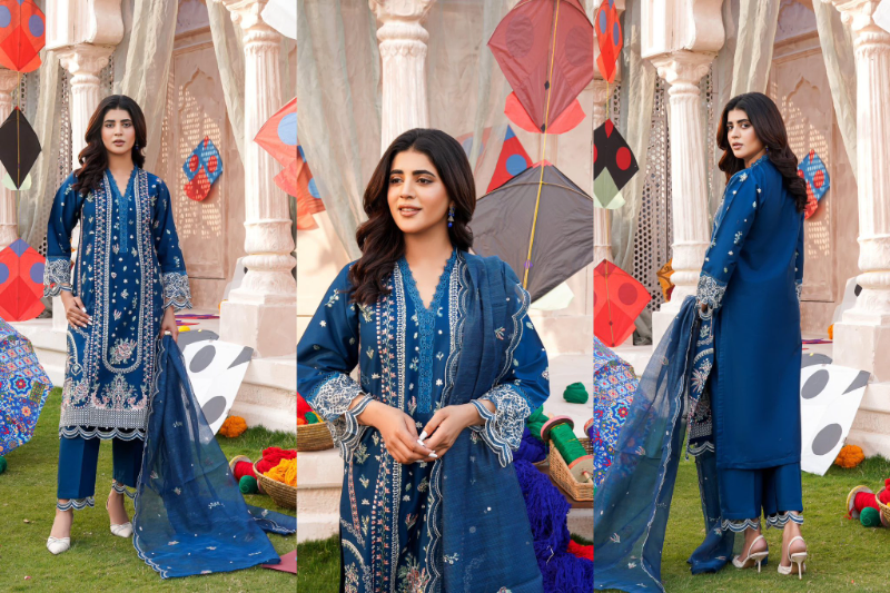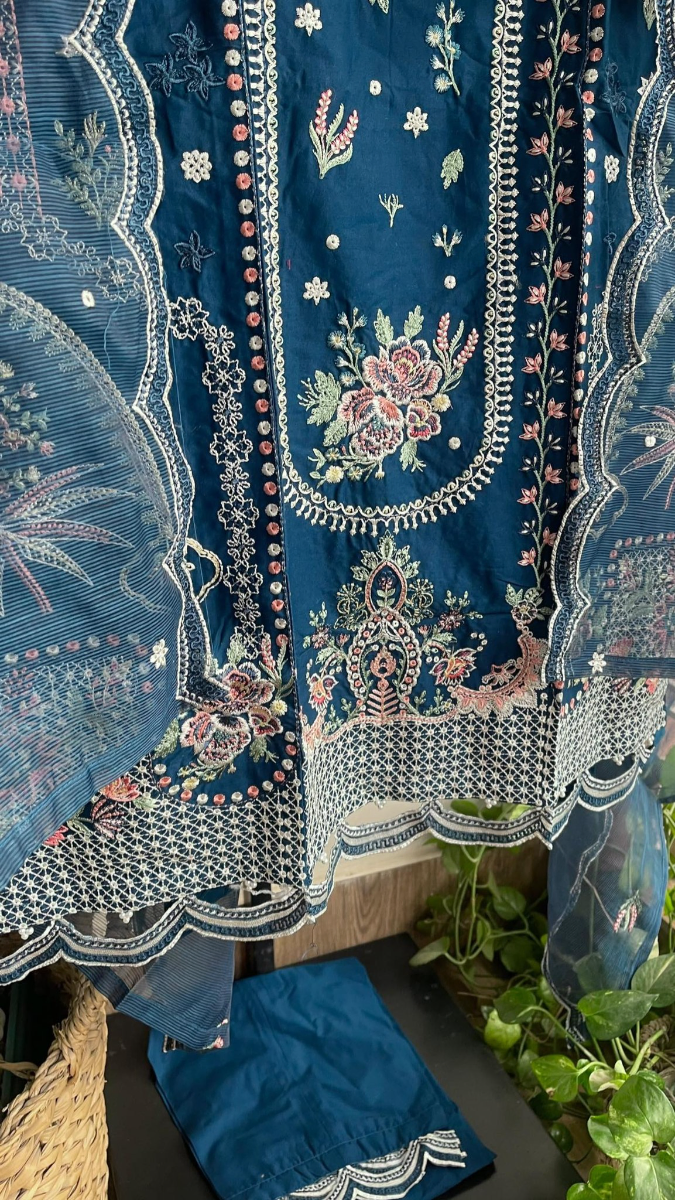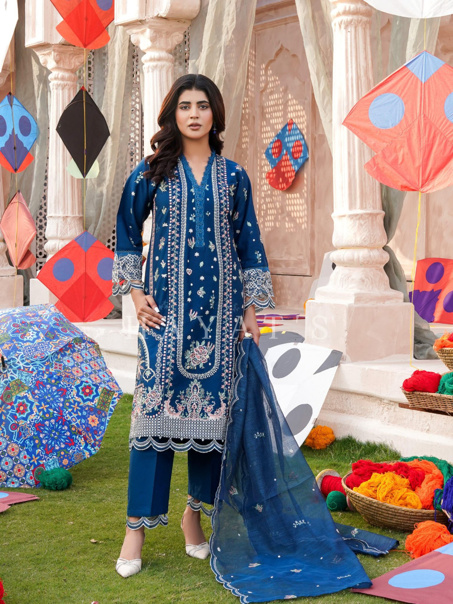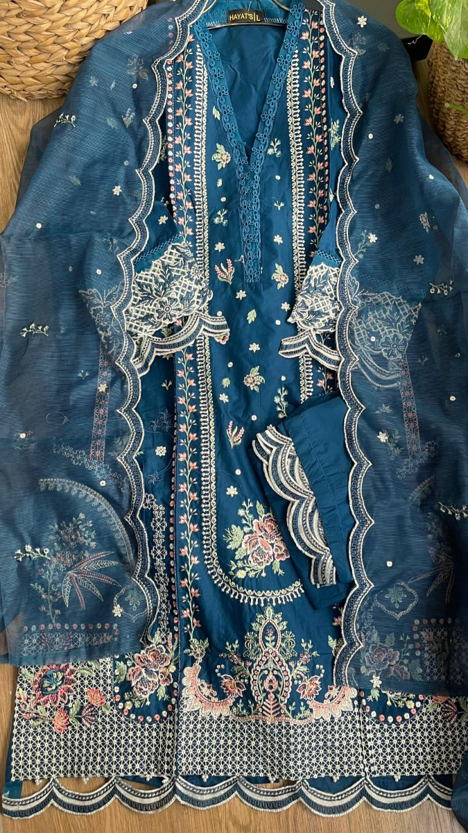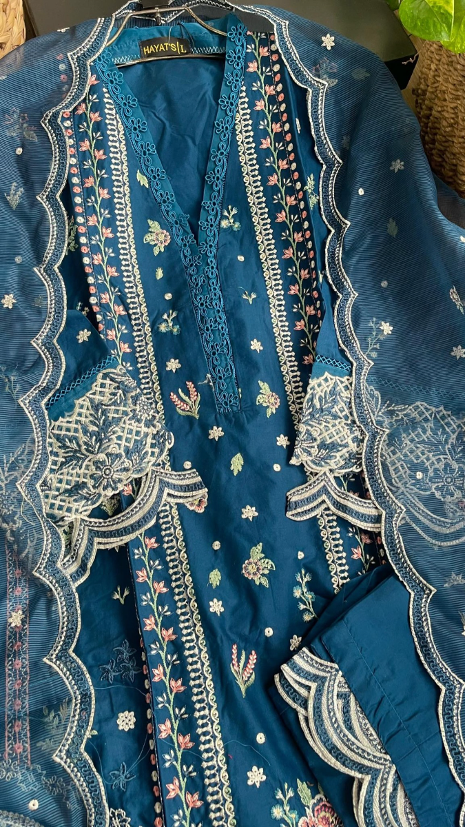 Original Pakistani Hayat’s Luxury Cotton Stitched 3Pcs, Full Embroidered Shirt With Sequin, Lacework & Embroidered Borders On Sleeves & Khaddi Net Dupatta & Cotton Pant