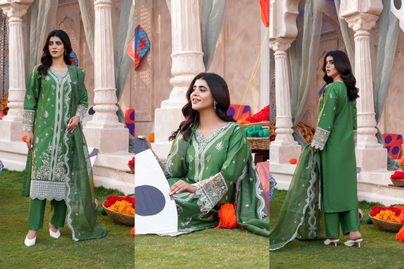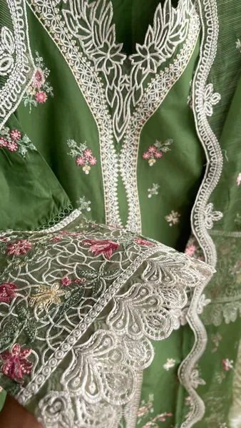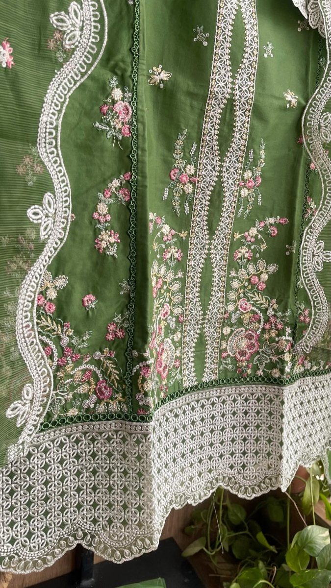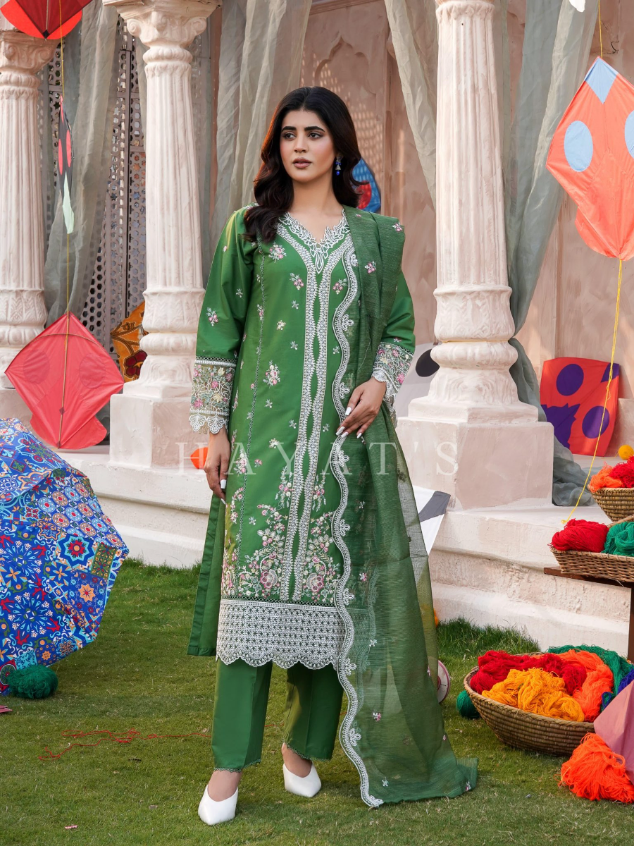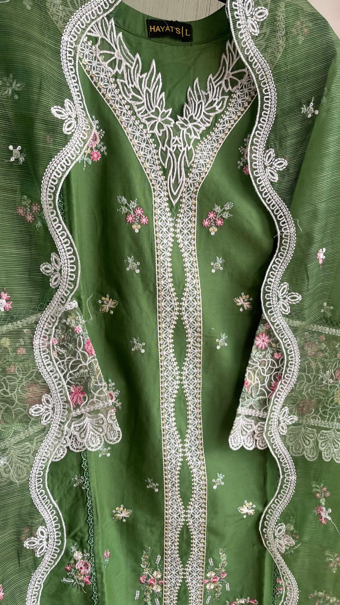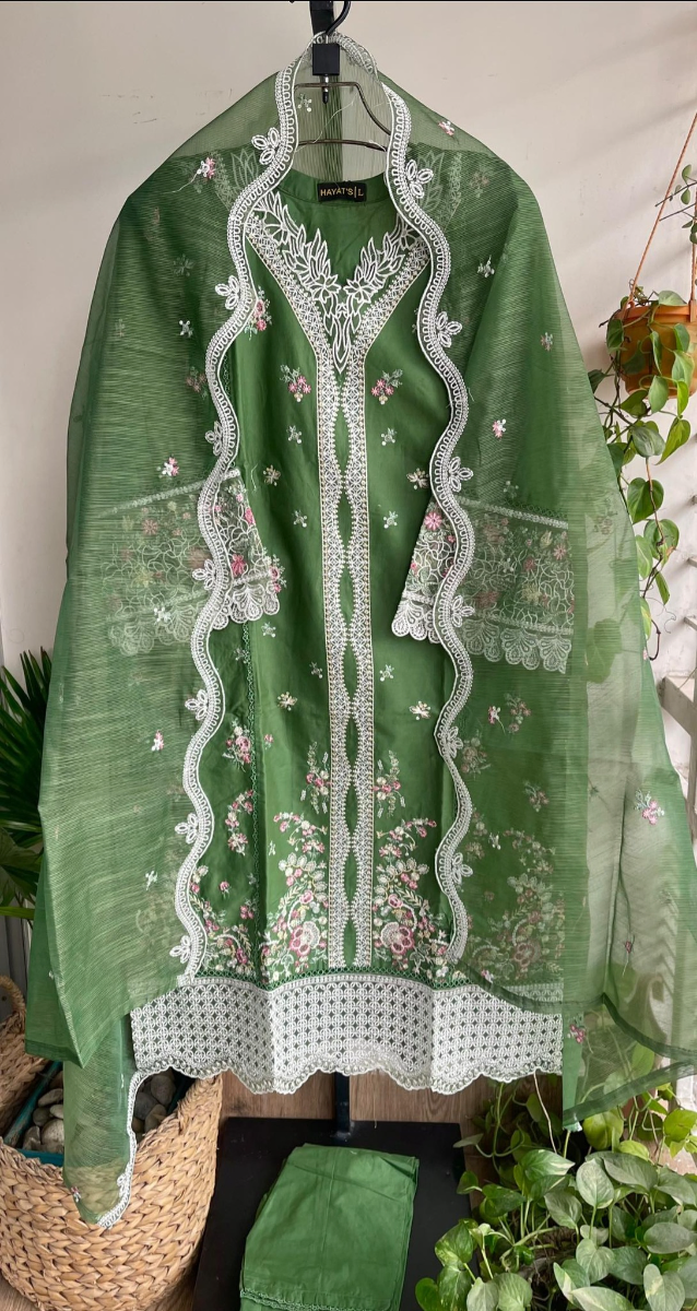 Original Pakistani Hayat’s Luxury Cotton Stitched 3Pcs, Full Embroidered Shirt With Sequin, Lacework & Embroidered Borders On Sleeves & Khaddi Net Dupatta & Cotton Pant
