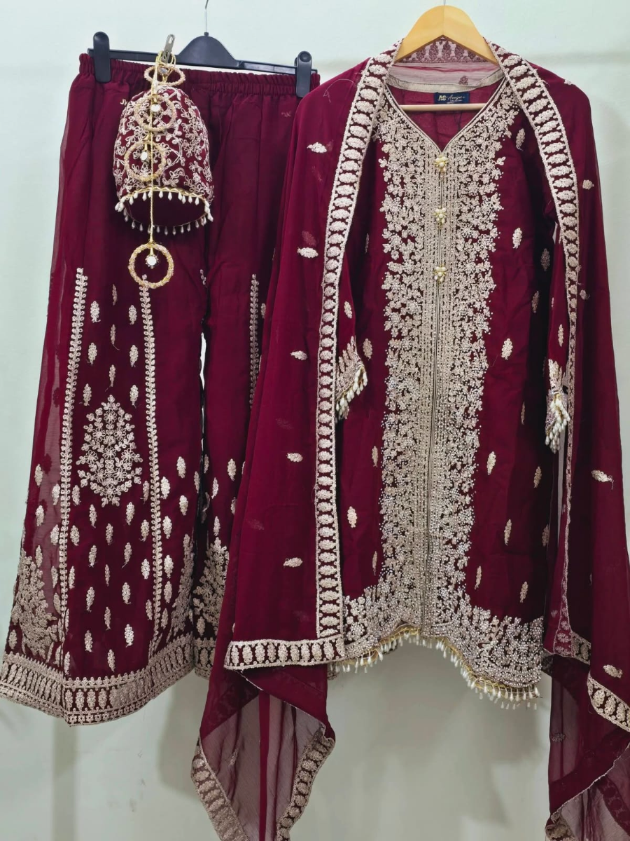 Original Pakistani Luxury Chiffon Sharara Stitched 3Pcs With Embroidered Shirt With Stone, Stone work, Sequne, Tassel Work & Bag , & Embroidered Chiffon Dupatta & Embroidered Borders On Sleeve Tassel Work & Chiffon Sharara pant