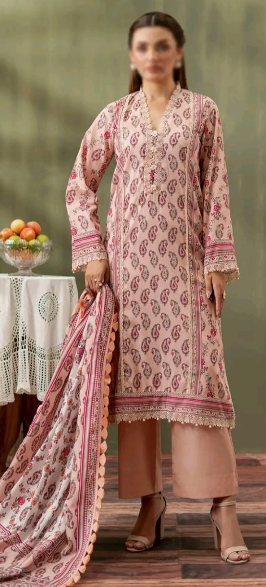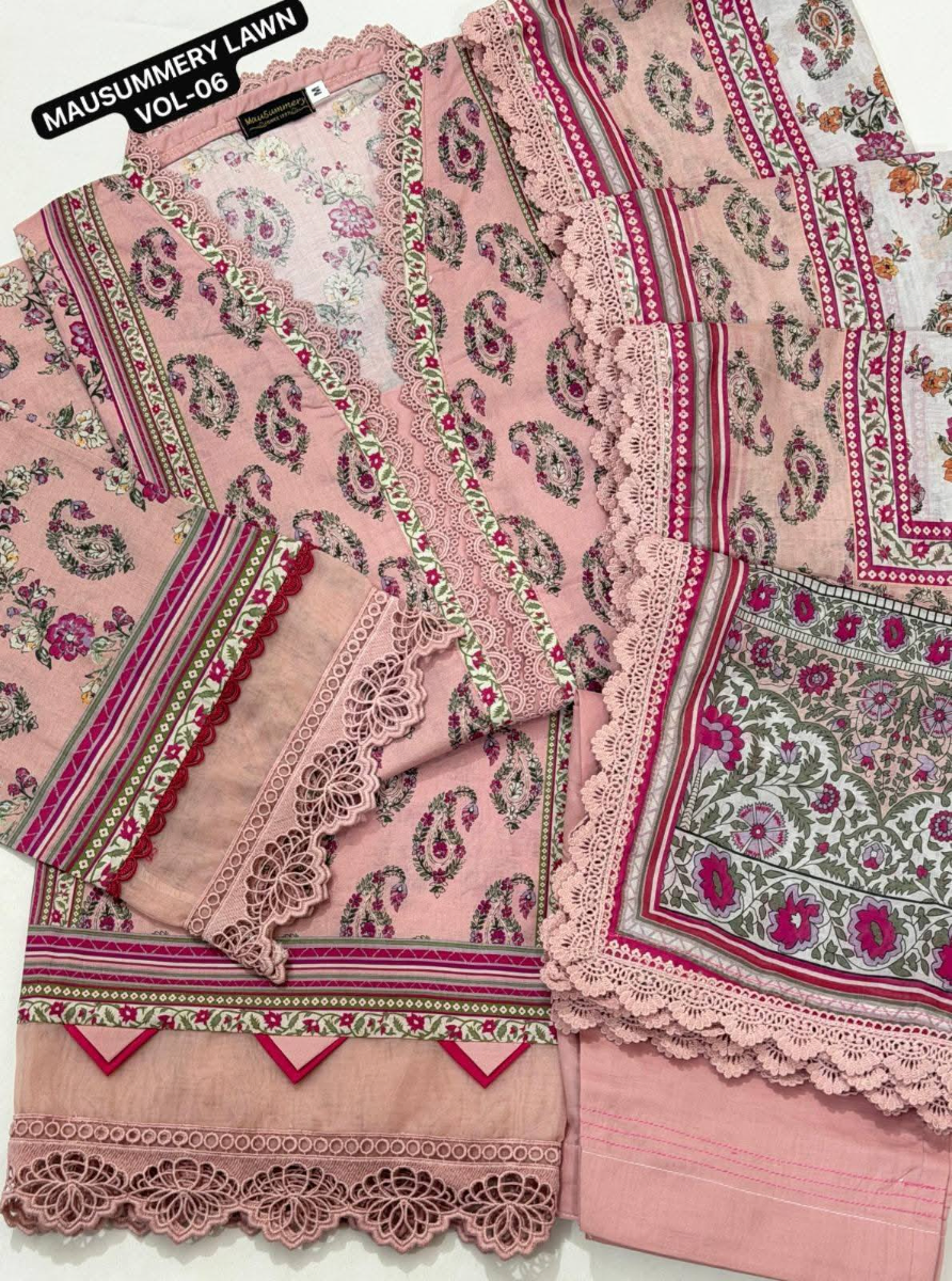 Original Pakistani Mausummery Premium Lawn Stitched 3Pcs, Full Printed Shirt With Lacework & Printed Lacework Borders On Sleeves, Printed Lacework Lawn Dupatta & Cotton Pant