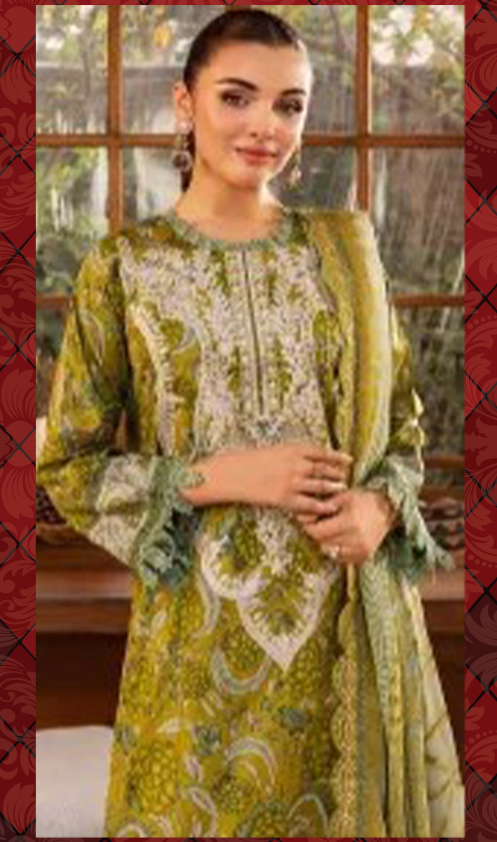 Original Pakistani Polawn Embroidered Stitched Lawn 3 Pcs, Full Embroidderd With Printed Shirt With Lase Work, Chiffon Printed Dupatta & Borders