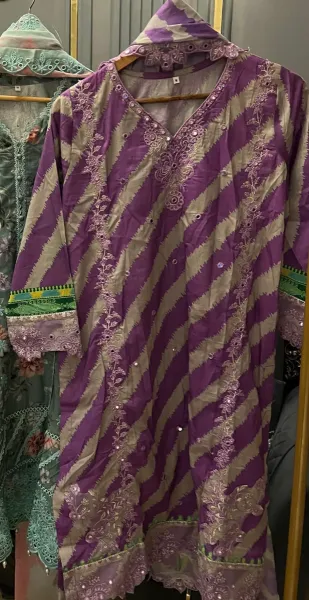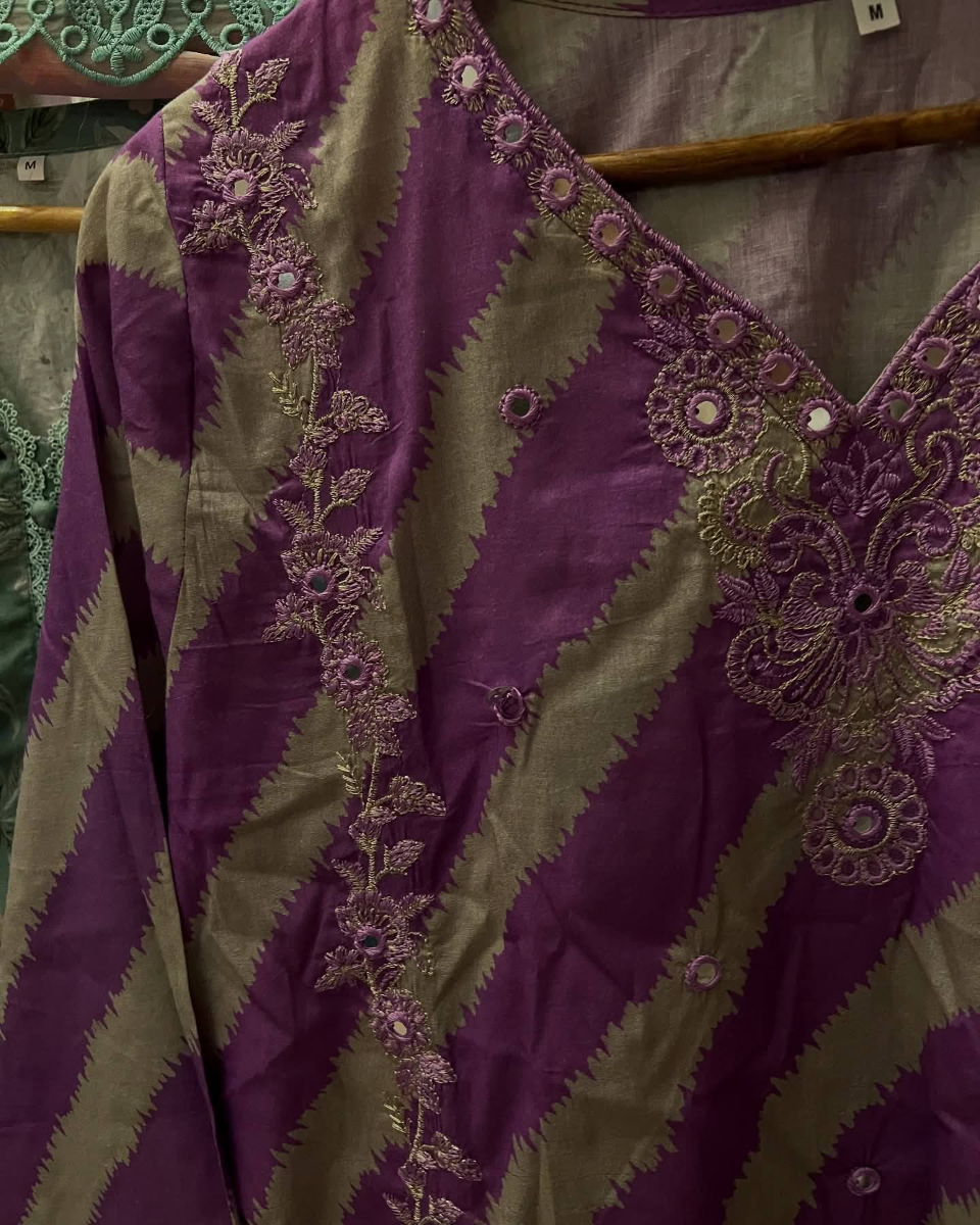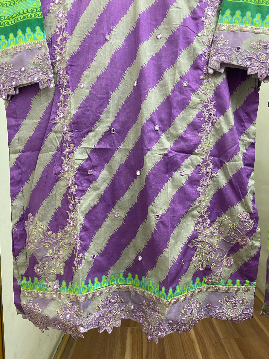 Original Pakistani Pure Lawn luxury embroidered and foilwork collection By Falaksapparel Stitched 3Pcs with Embroidered Printed Shirt With Mirror Work & Printed Silk Dupatta & Full Printed & Embroidered Work Borders On Sleeve With Cotton Pant