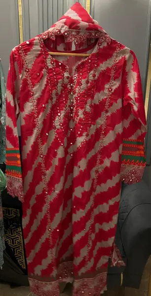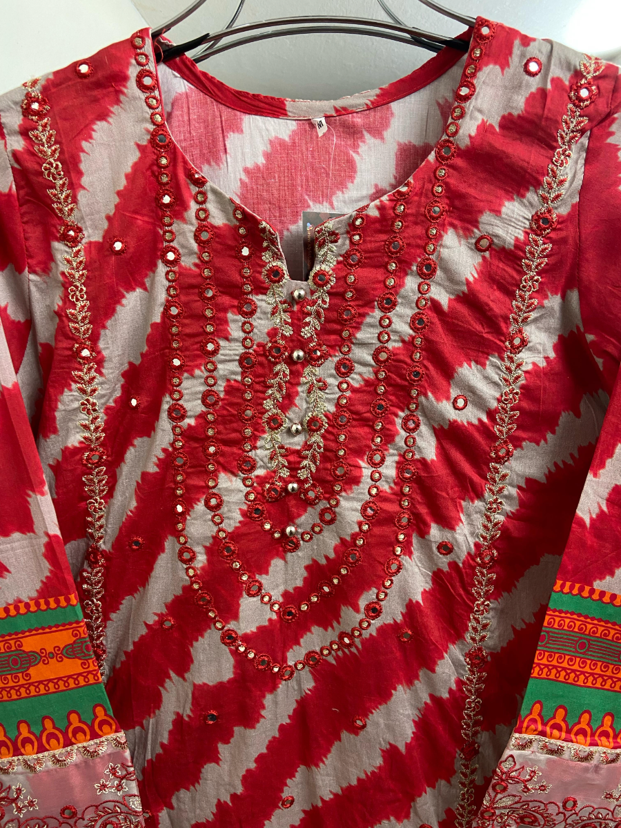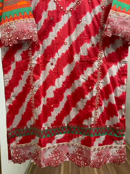 Original Pakistani Pure Lawn luxury embroidered and foilwork collection By Falaksapparel Stitched 3Pcs with Embroidered Printed Shirt With Mirror Work & Printed Silk Dupatta & Full Printed & Embroidered Work Borders On Sleeve With Cotton Pant