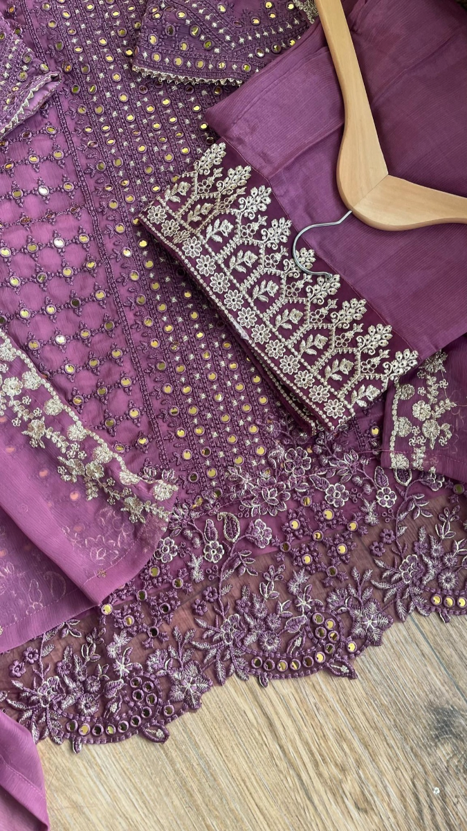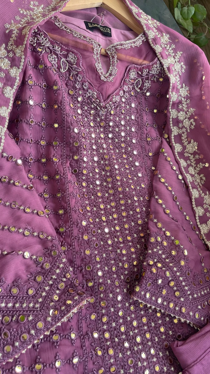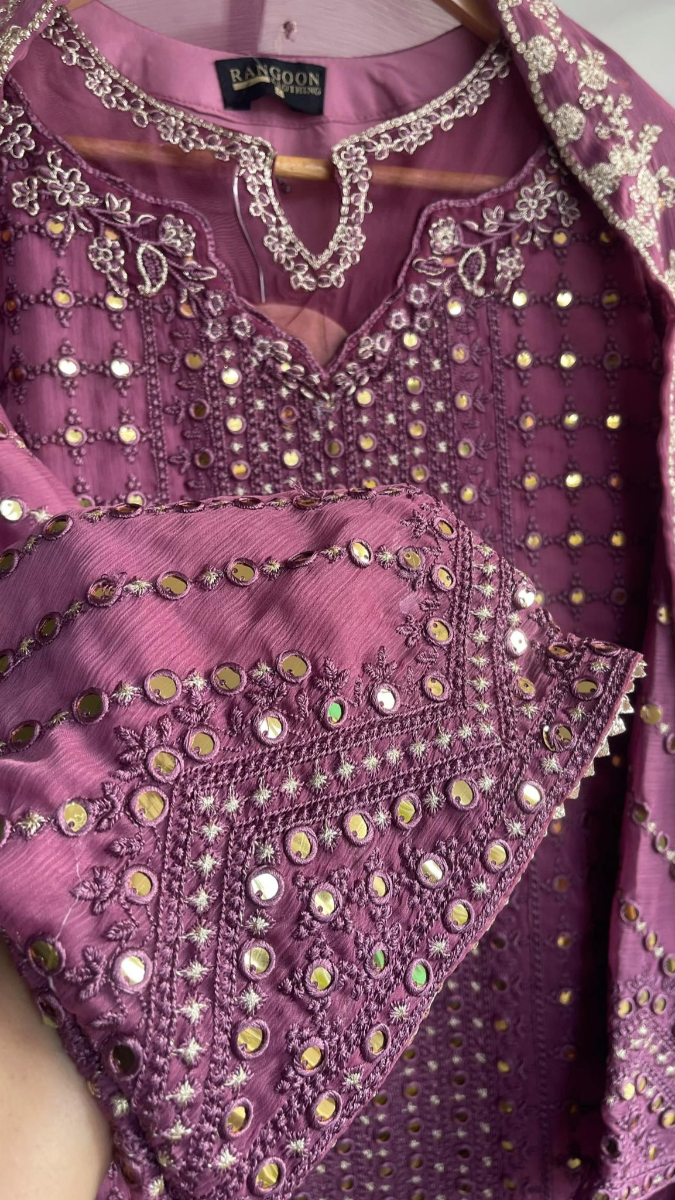 Original Pakistani Rangoon Chiffon Stitched 3Pcs, With Full Embroidered Shirt With Dollar work, Sequne Work & Embroidered Chiffon Dupatta & Embroidered Borders On Sleeve Sequne Work & Silk Pant