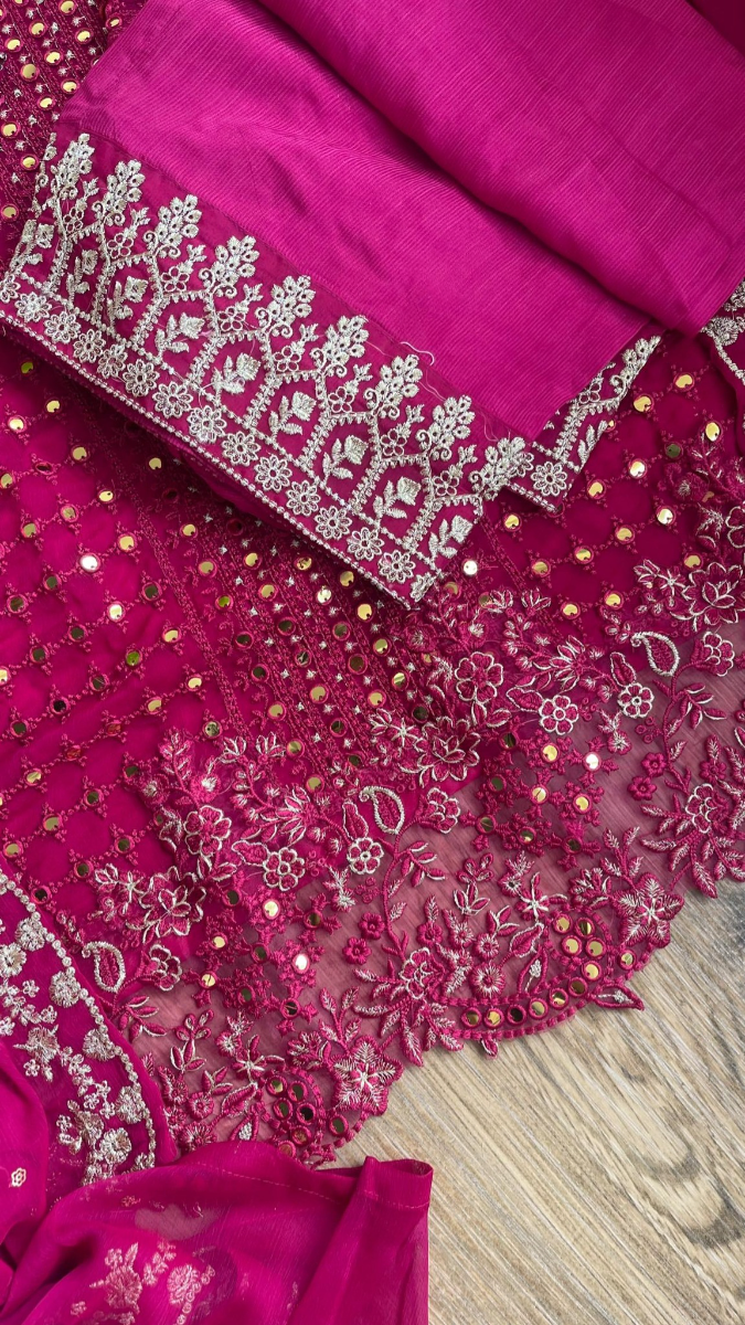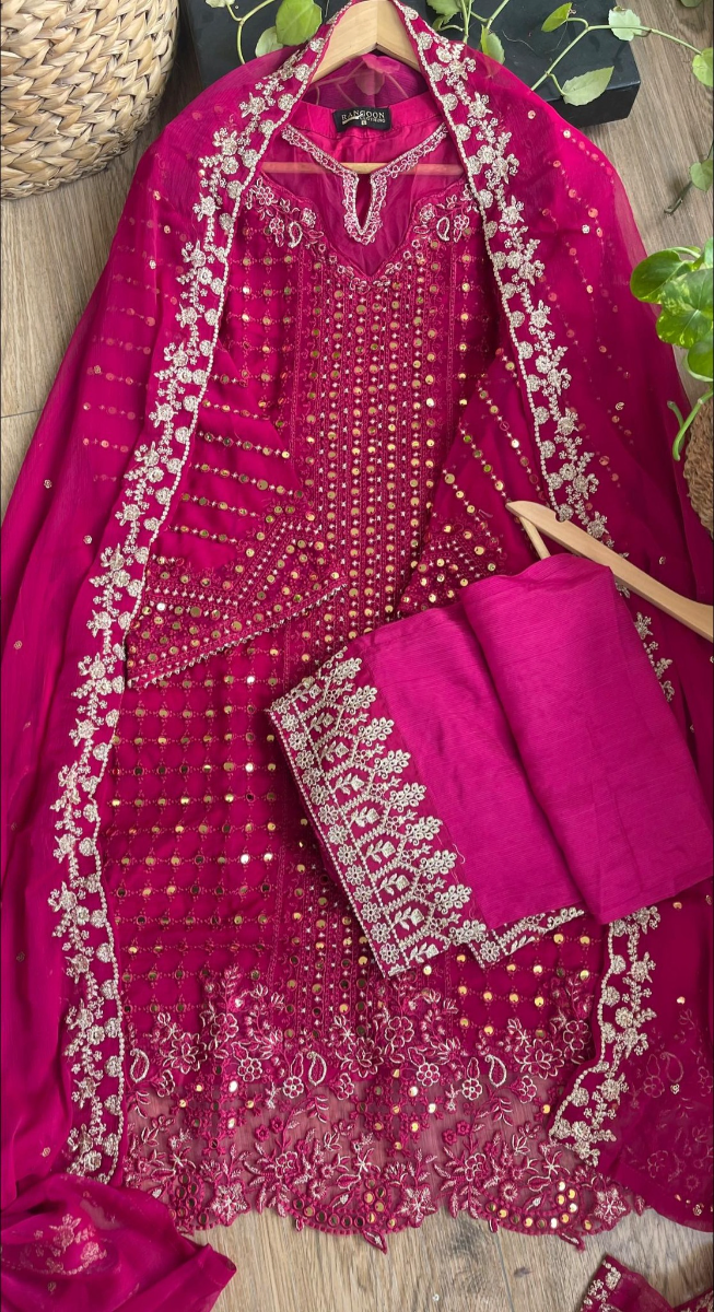 Original Pakistani Rangoon Chiffon Stitched 3Pcs, With Full Embroidered Shirt With Dollar work, Sequne Work & Embroidered Chiffon Dupatta & Embroidered Borders On Sleeve Sequne Work & Silk Pant