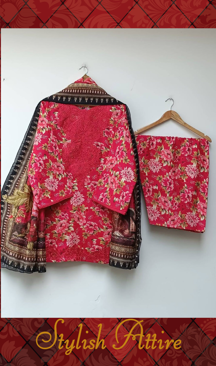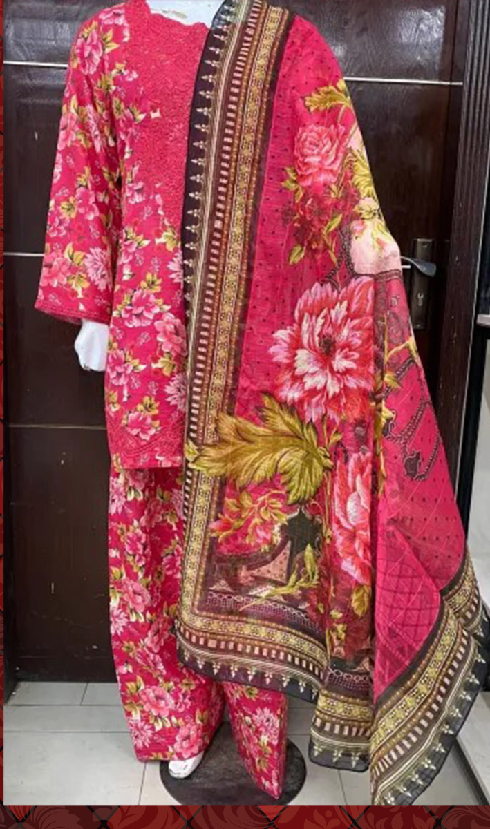 Additional Description: Maysa is a refined 3-piece outfit featuring intricate embroidery and artistic printwork. Paired with a traditional farshi shalwar, it offers a timeless and elegant look for any special occasion. Disclaimer: Actual product color may vary slightly from the image