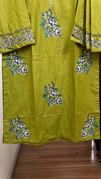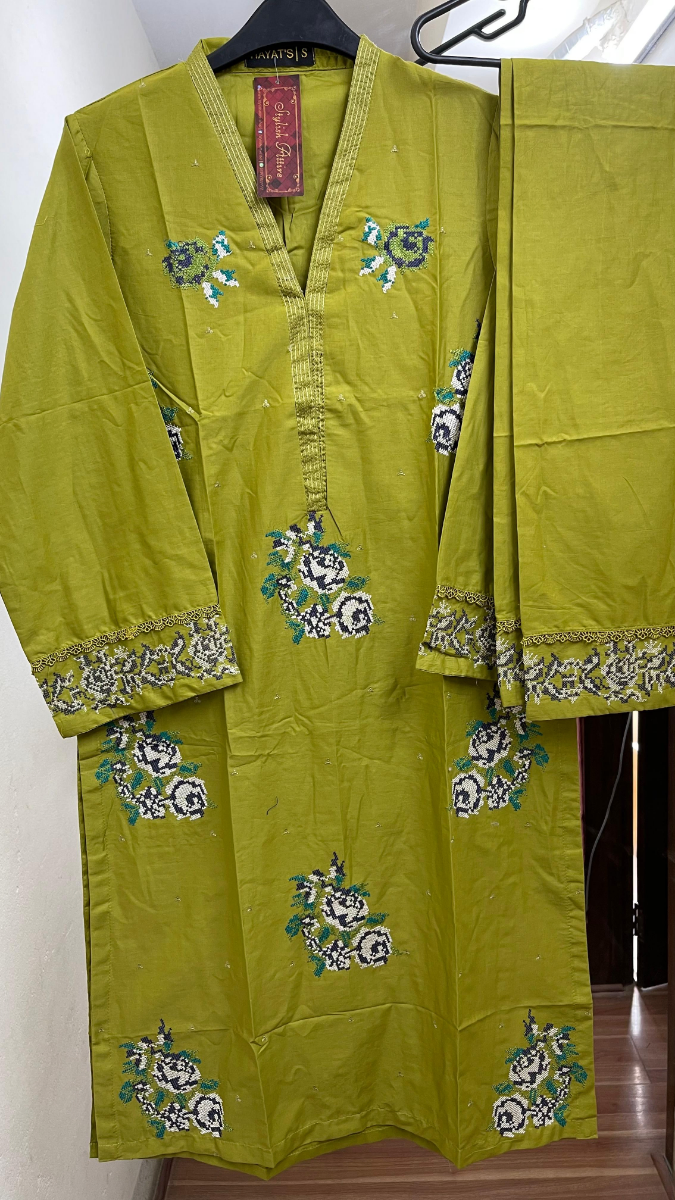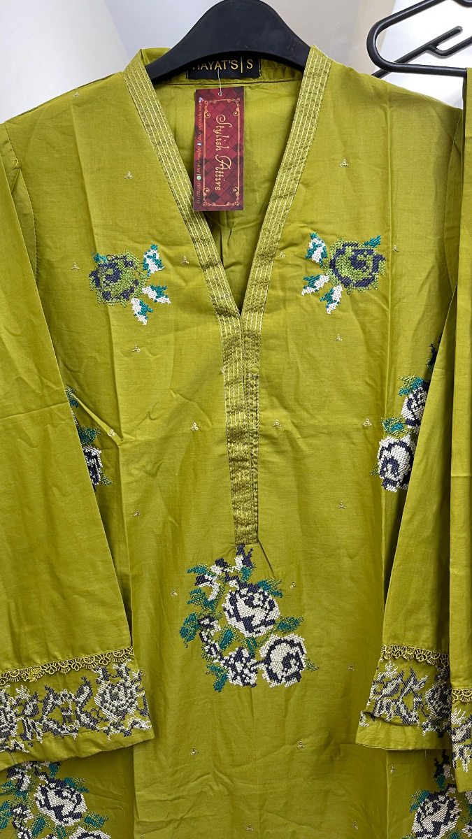 Pakistani Original Hayat Stitched Cotton Co-ords 2 Pcs, Embroidered Shirt With Embroidered work & Embroidered Borders On Sleeves & Cotton Pant