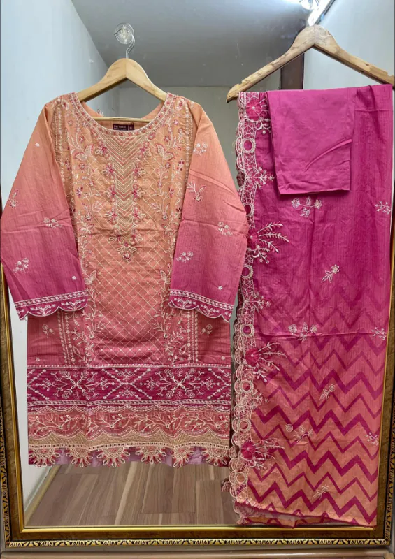 Pakistani Bin Saeed Stitched Tie & Dye Lawn Luxury Formal 3Pcs, Embroidered Shirt With Cut Work, Sequin & Embroidered Cutwork Cotton Dupatta & Embroidered Borders On Sleeves & Cotton Pant