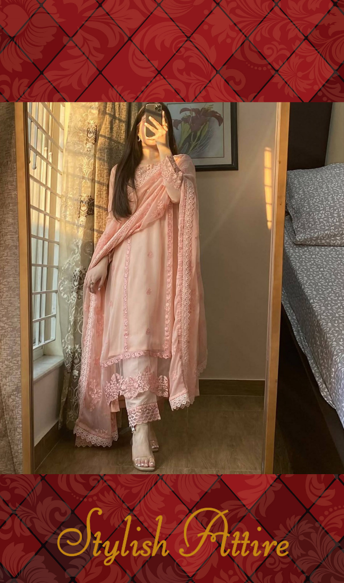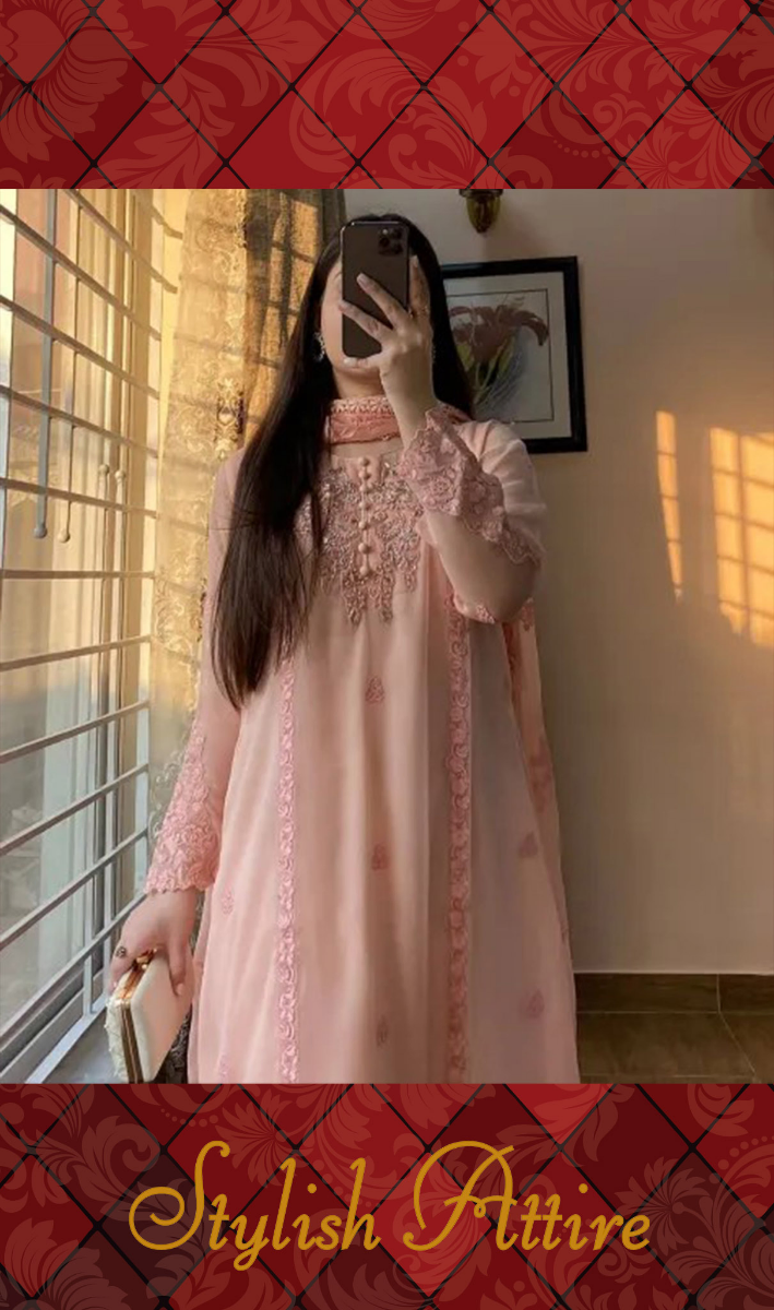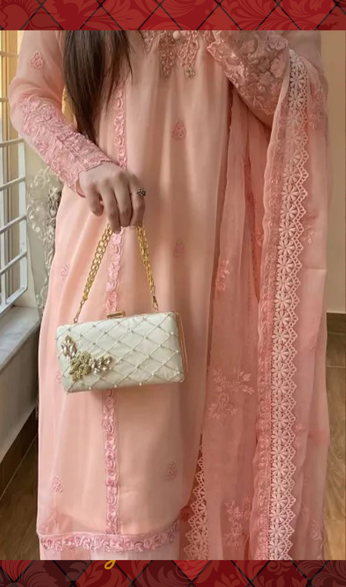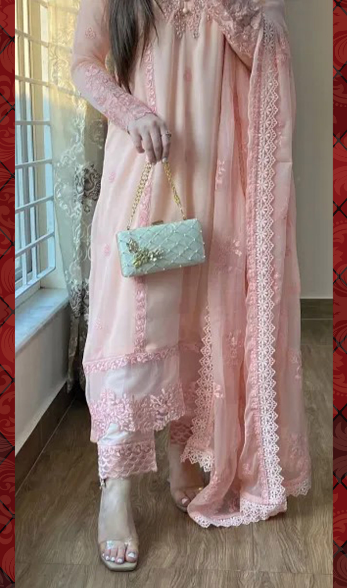 Pakistani boutique Femenite Luxury Chiffon Stitched 3Pcs, Full Embroidered Shirt With & Embroidered Borders On Sleeves & Embroidered Chiffon Dupatta & Chiffon Pant