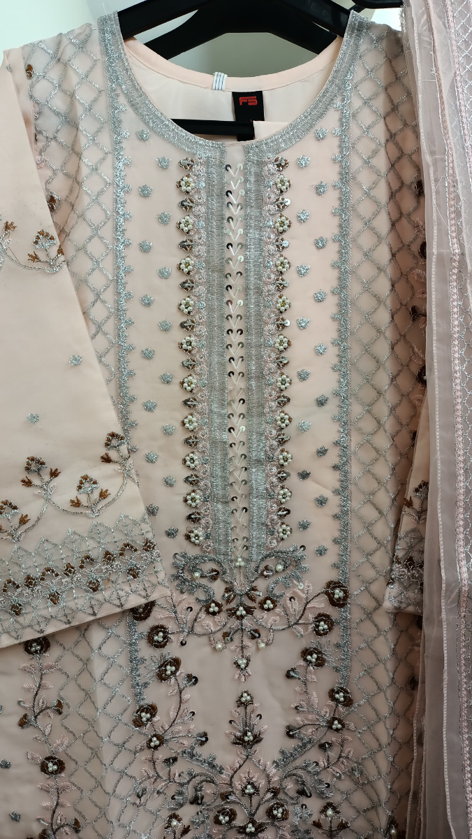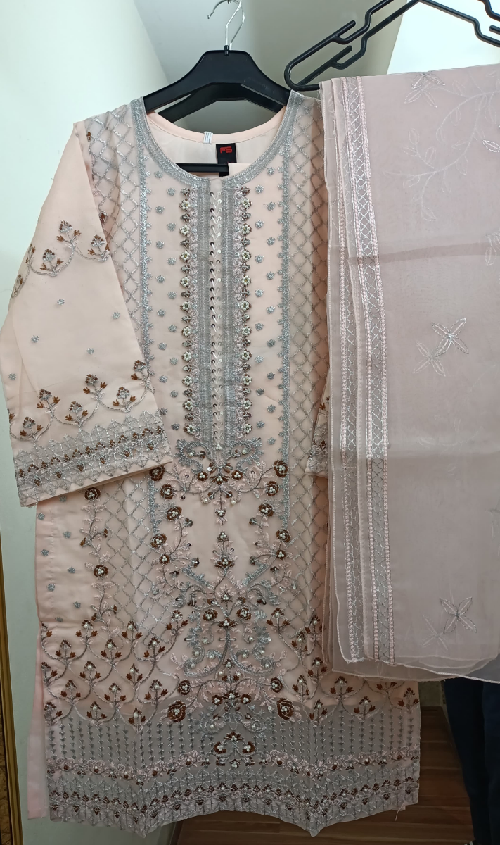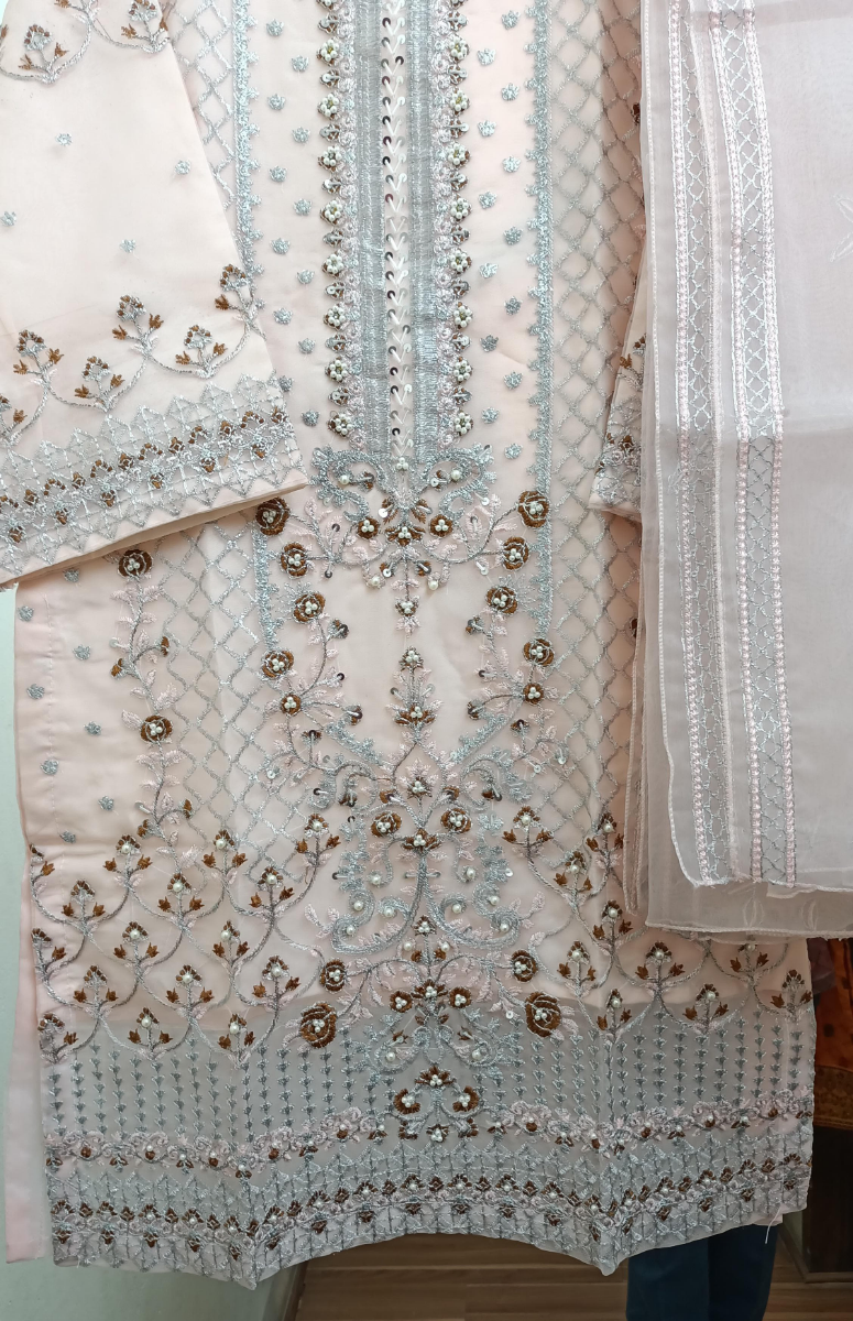 Pakistani Boutique Organza Stitched 3 Pcs, Embroidered Shirt With Sequin, Parl, Stone & Embroidered Organza Dupatta & Embroidered Borders On Sleeves & Silk Pant