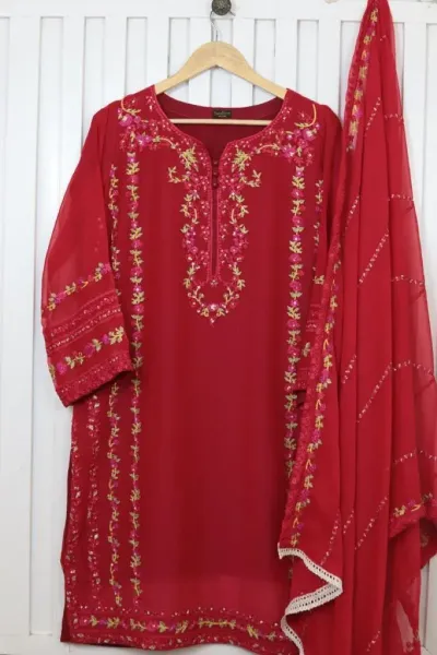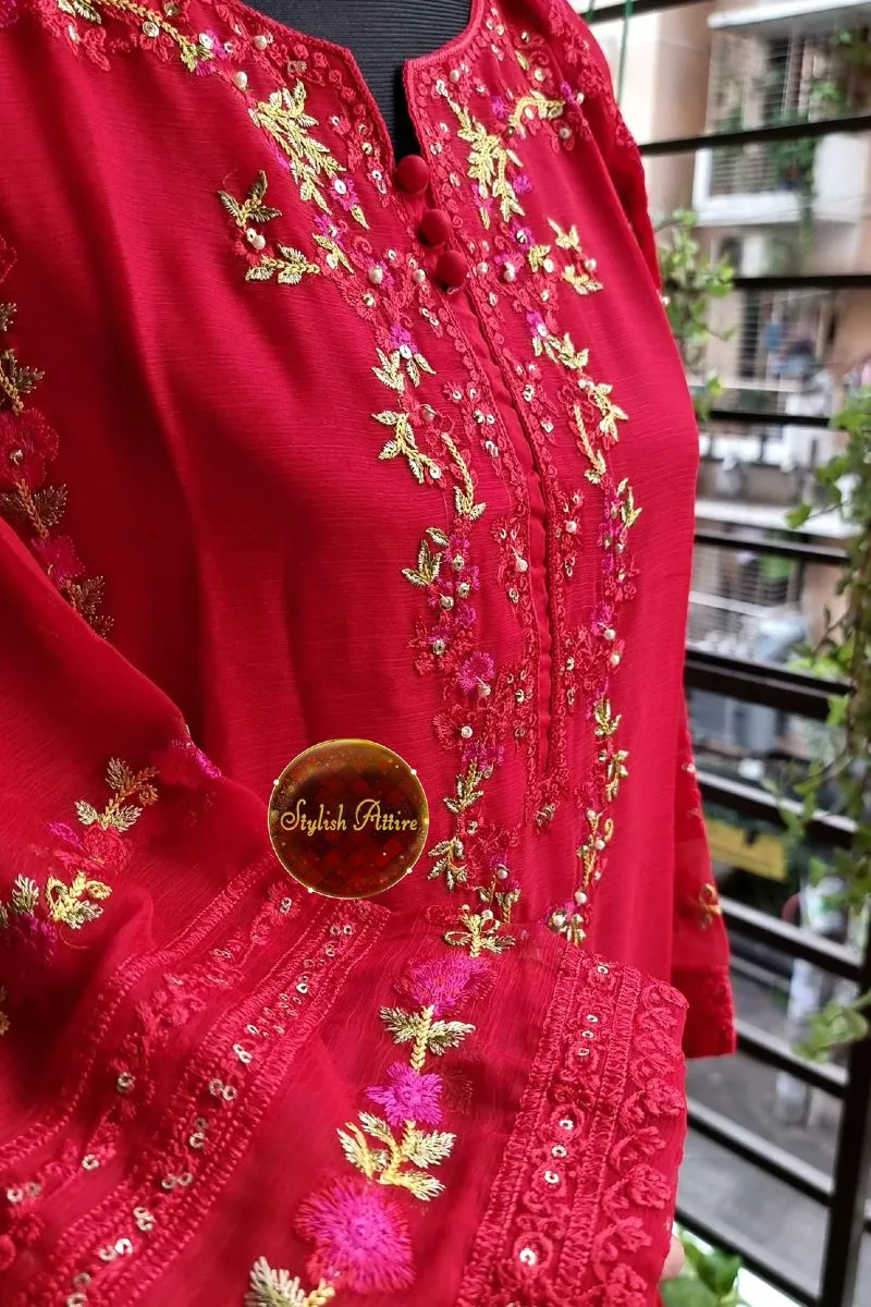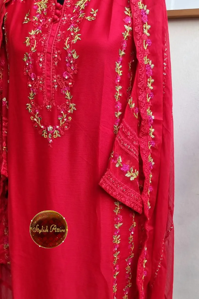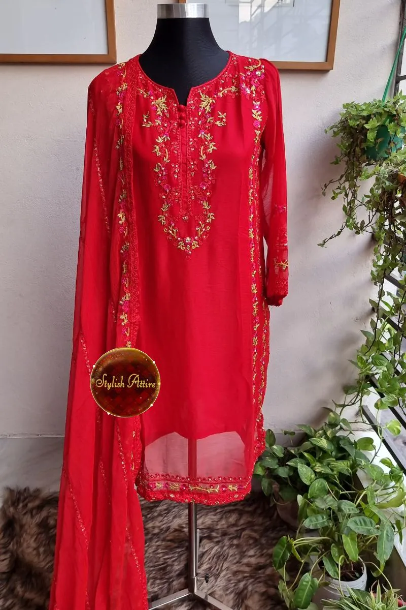 Pakistani Chiffon Stitched 2 Pcs, Embroidered Shirt With Parl, Sequence & Embroidered Dupatta & Embroidered Borders On Sleeves.