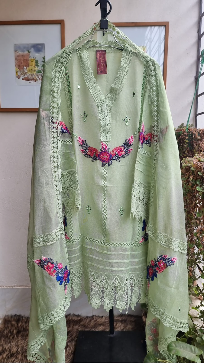 Pakistani Cotton Net Semi Stitched 2pcs, Embroidered Shirt With Lacework, Parl, Work & Embroidered Dupatta With Lacework & Embroidered Borders On Sleeves