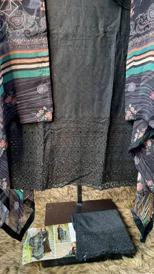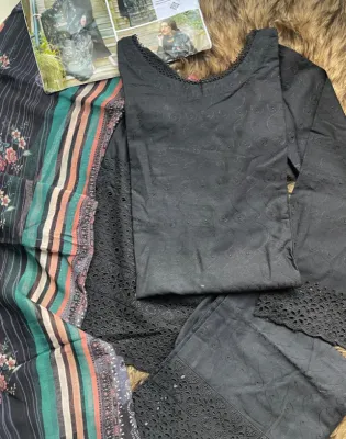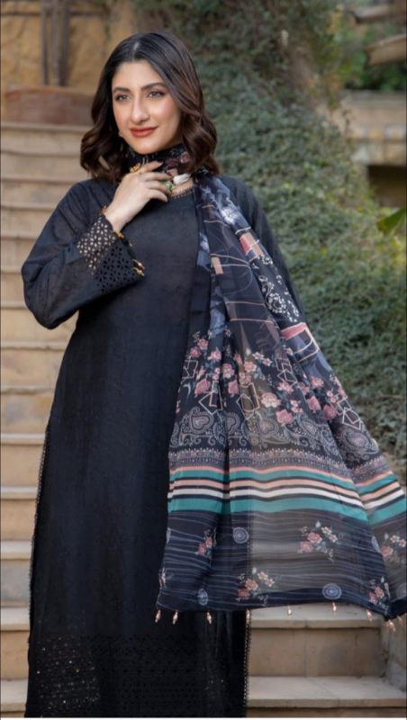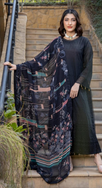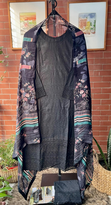 Pakistani Cotton Stitched 3Pcs by M.I.Creation, Full Embroidered Shirt With Cut Work Lace Work & Printed Chiffon Dupatta & Embroidered Borders On Sleeves & Cotton pent