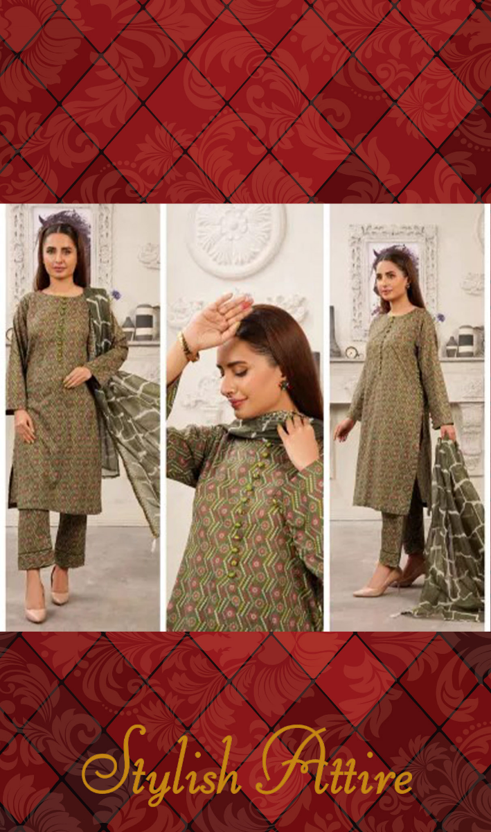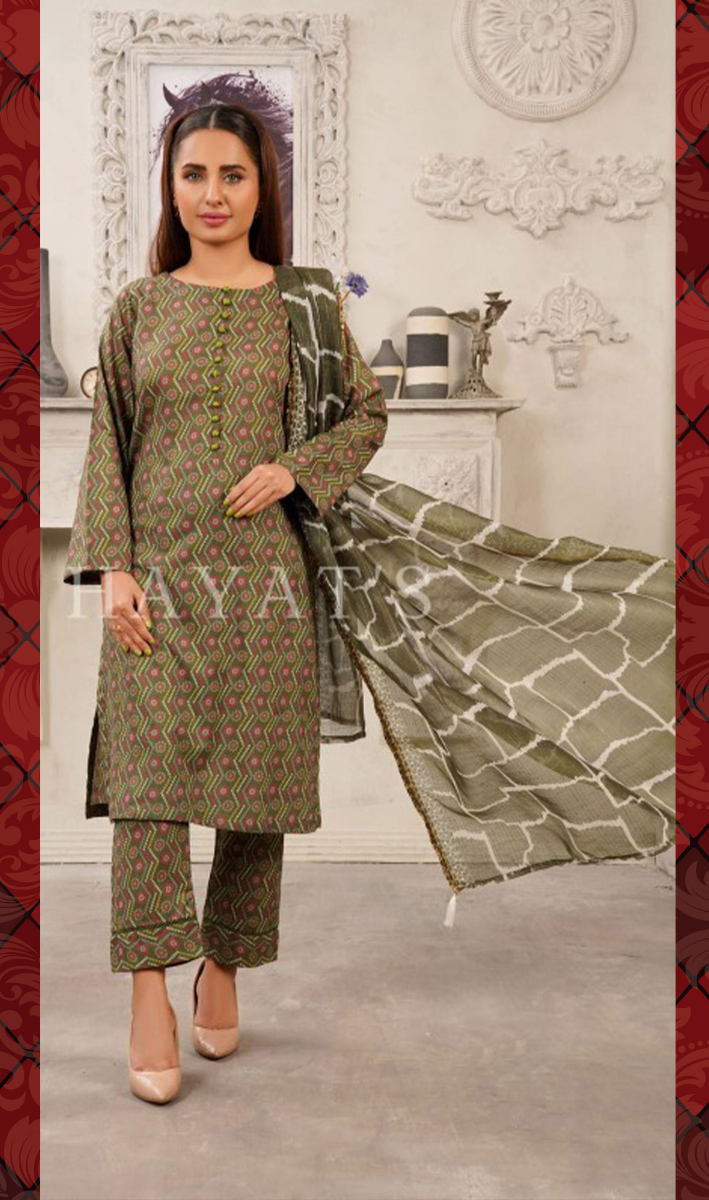 Pakistani Hayat's Stitched Cotton 3pcs, Printed Shirt With Batton Work, Maysori Cotton Dupatta & Printed Lace Work Borders On Sleeves & Printed Cotton Pant