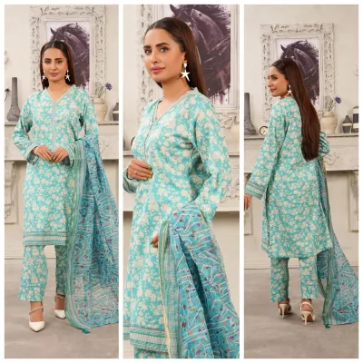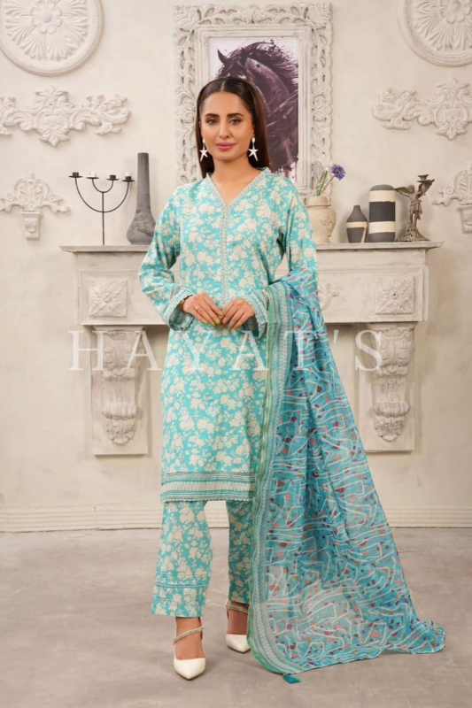 Pakistani Hayat's Stitched Cotton 3pcs, Printed Shirt With Lace Work, Maysori Cotton Dupatta & Printed Lace Work Borders On Sleeves & Cotton Pant