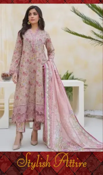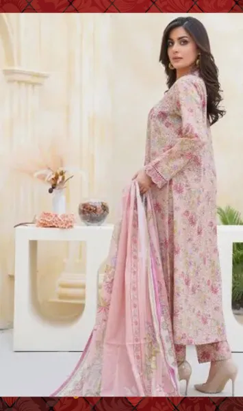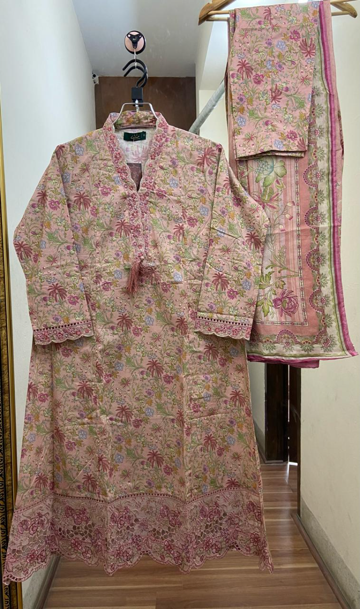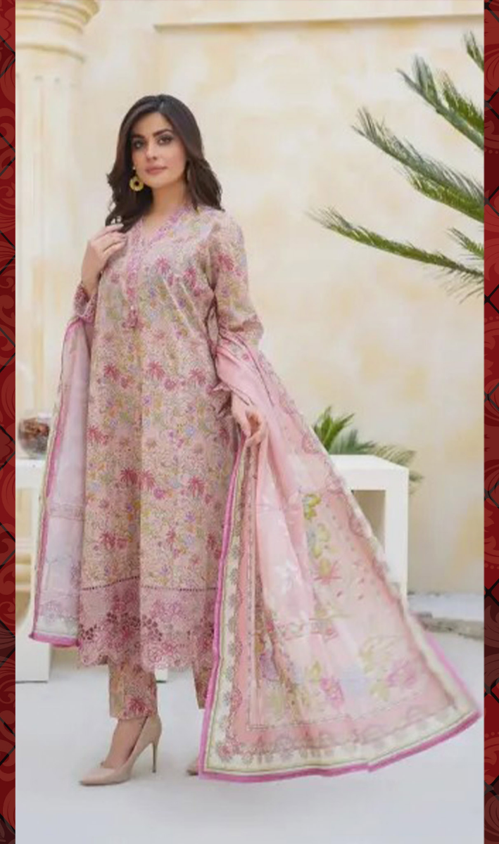 Pakistani Husnara Candy Floss Signature Embroidered Lawn Stitched 3Pcs, Embroidered Shirt With Lase Work, Tarsel & Embroidered Borders On Sleeves & Printed Lawn Dupatta & Printed Cotton Pant