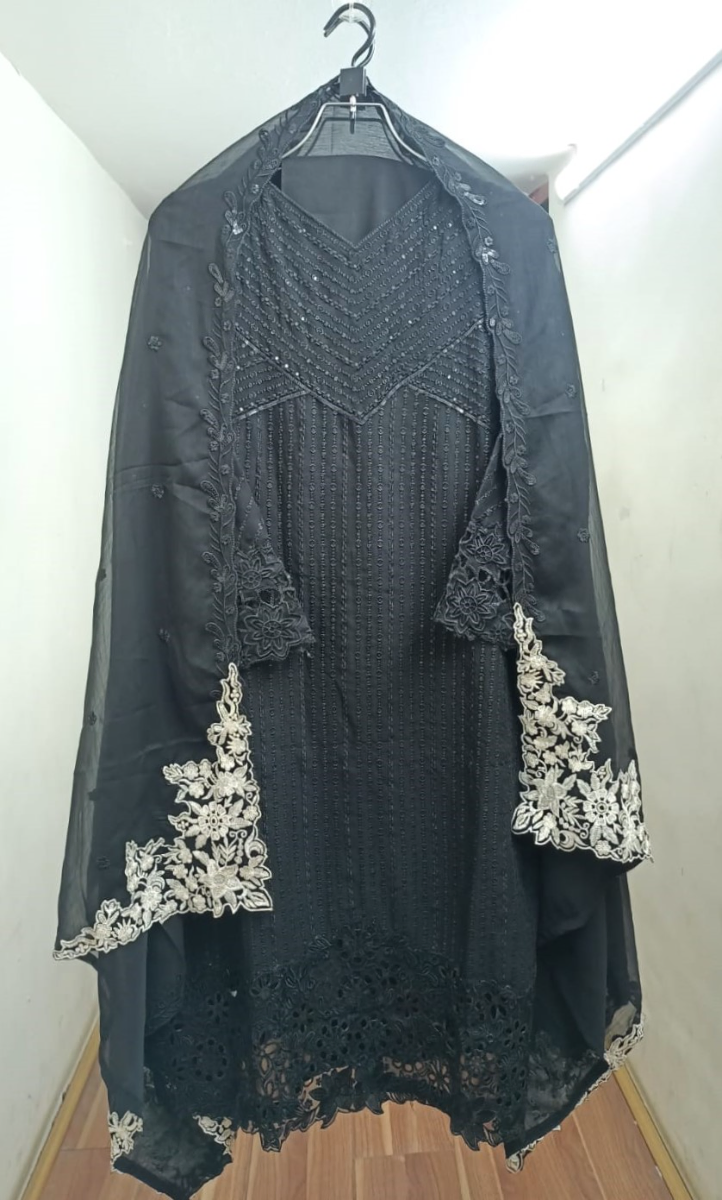 Pakistani Orginal Rangoon Chiffon Stitched 3 Pcs, Fuul Embroidered Chiffon Shirt With Sequne Work , Nackline Embroidered Work & Embroidered Chiffon Dupatta With Sequin & Embroidered Borders On Sleeve & Silk Pant