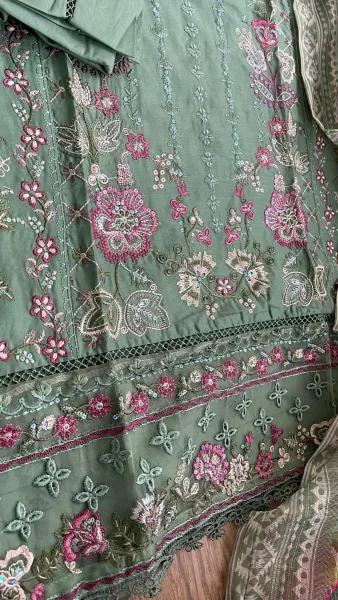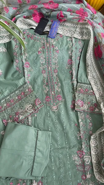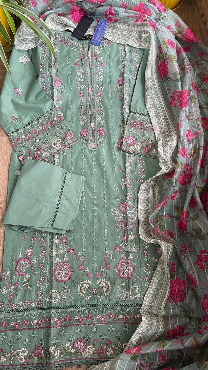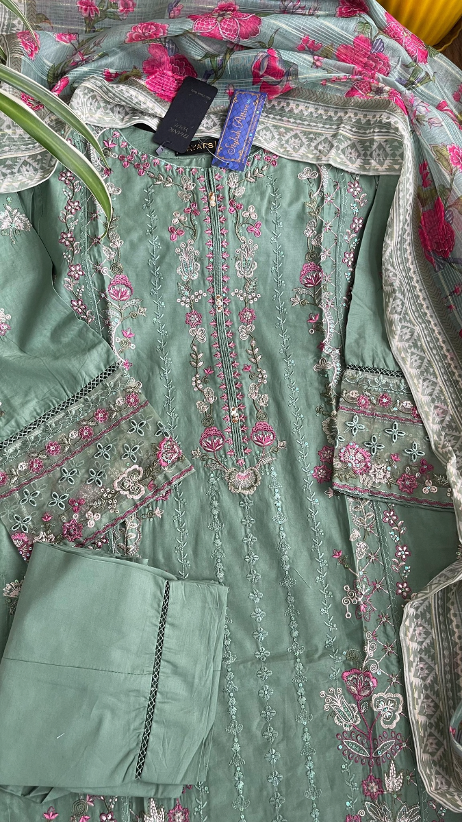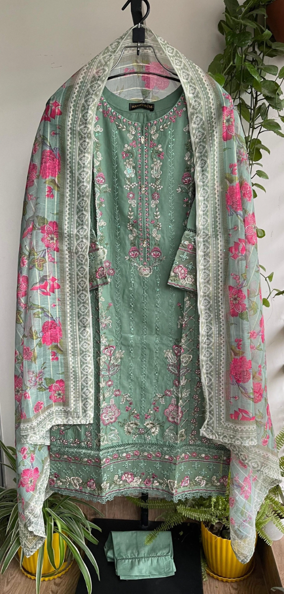 Pakistani Original Hayat’s Embroidered Stitched Cotton 3Pcs, Full Embroidered Shirt With Sequin, Mirror work, Lacework & Embroidered Borders On Sleeves & Printed Moysorii Cotton Dupatta & Cotton Pant