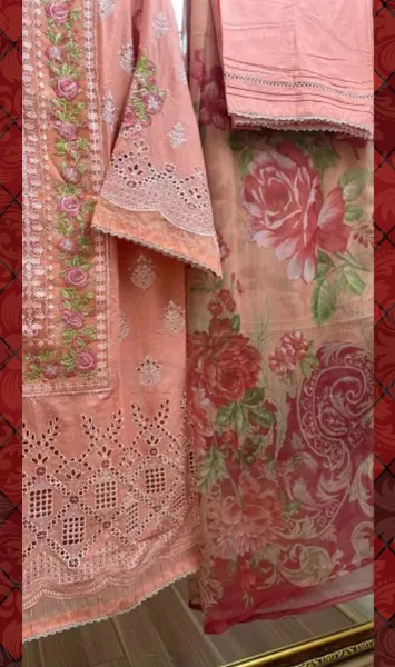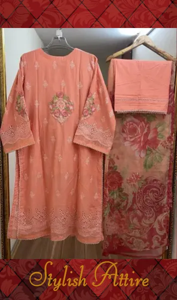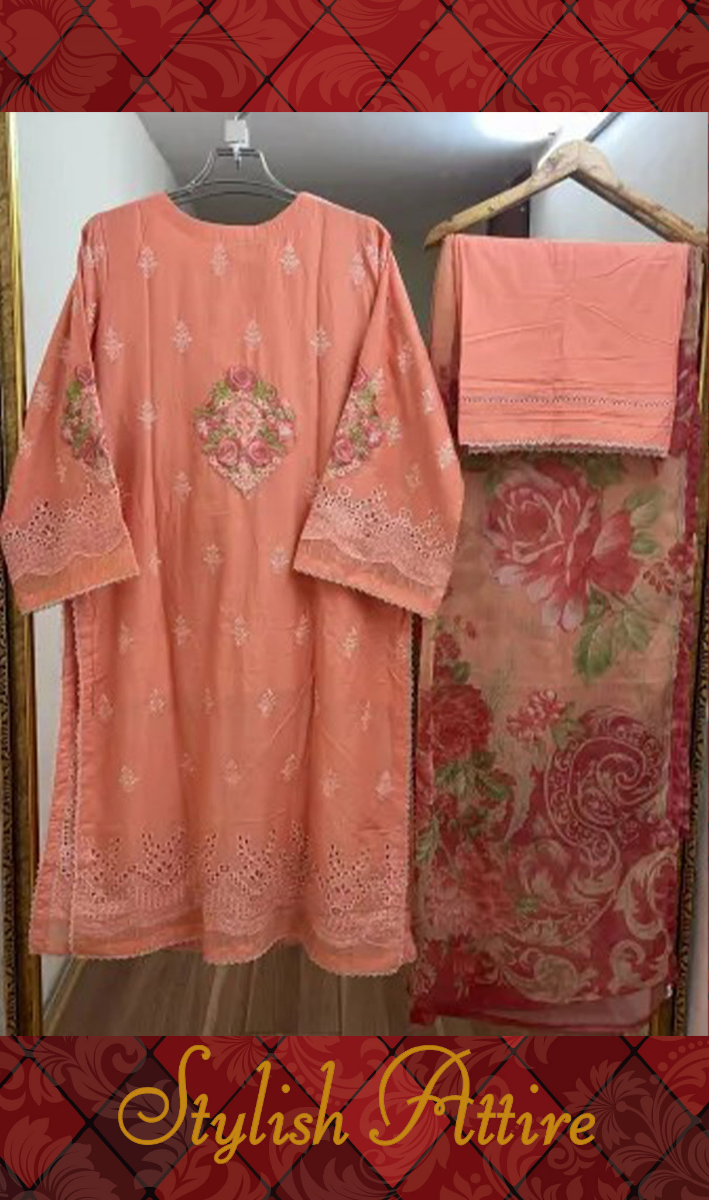Pakistani Original Adan’s Libas Luxury Lawn Stitched 3 Pcs, Embroidered Shirt With Ston Work & Embroidered Borders On Sleeves With Parl & Printed Chiffon Dupatta & Cotton Pant
