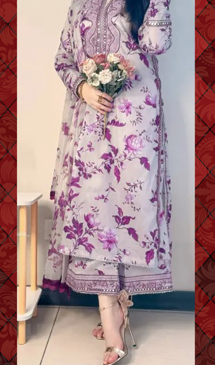 Pakistani Original Aneelas Pure Lawn Stitched 3Pcs, Full Embroidered & Printed Shirt With Sequin, Dollarlace work, Lacework & Embroidered Borders On Sleeves & Lace Work Chiffon Dupatta & Cotton Pant