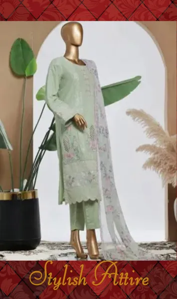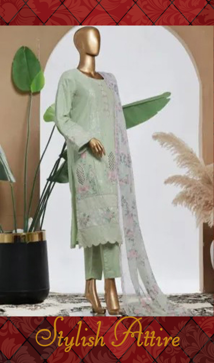 Embroidered Shirt With Sequin & Printed Chiffon Dupatta & Embroidered Borders On Sleeve With & Cotton Pant