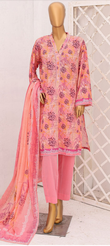 Pakistani Original Bin saeed Stitched Cotton 3pcs, Printed Shirt With Lace work & Borders On Sleeves & Cotton Pant With Printed Dupatta.