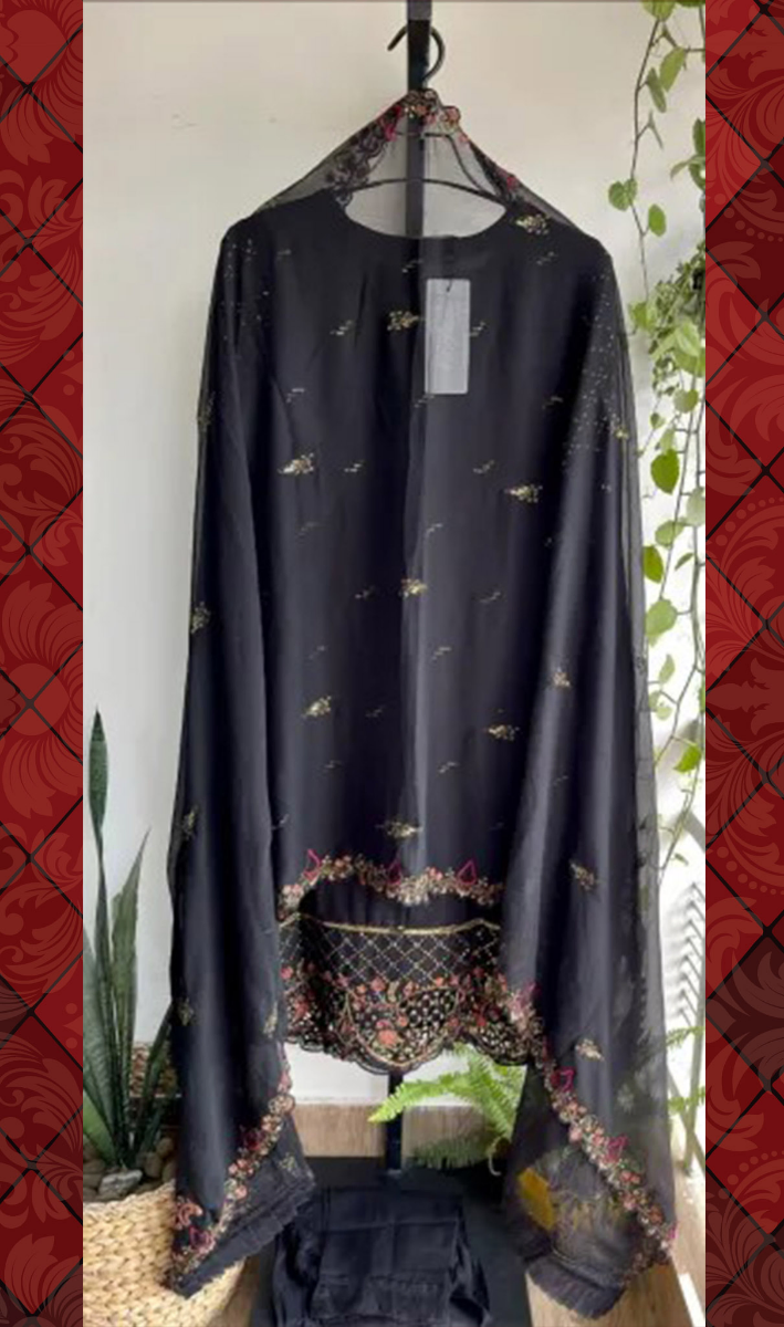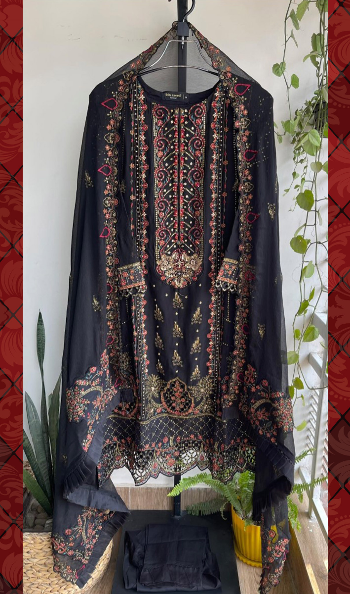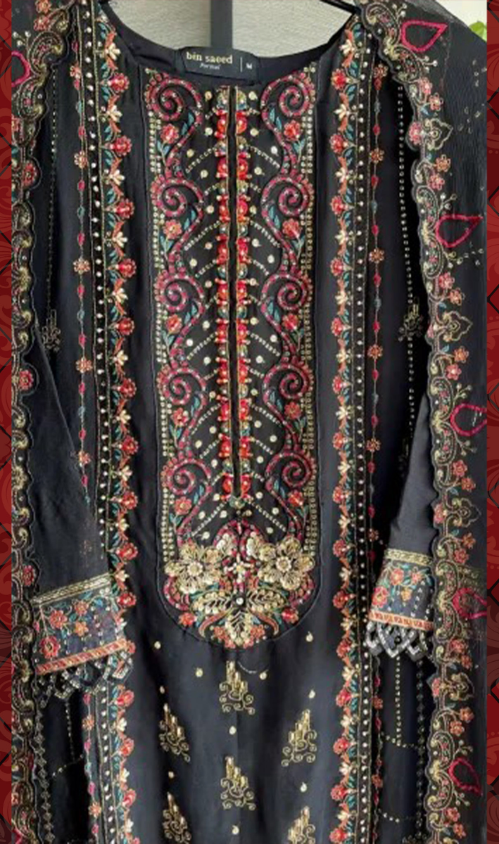 Pakistani Original Bin Saeed Luxury Chiffon stitched 3 Pcs, Embroidered Shirt With Sequin, Cutwork, Lasework & Embroidered Chiffon Dupatta With Sequin & Embroidered Borders On Sleeve With Sequin & Silk Pant