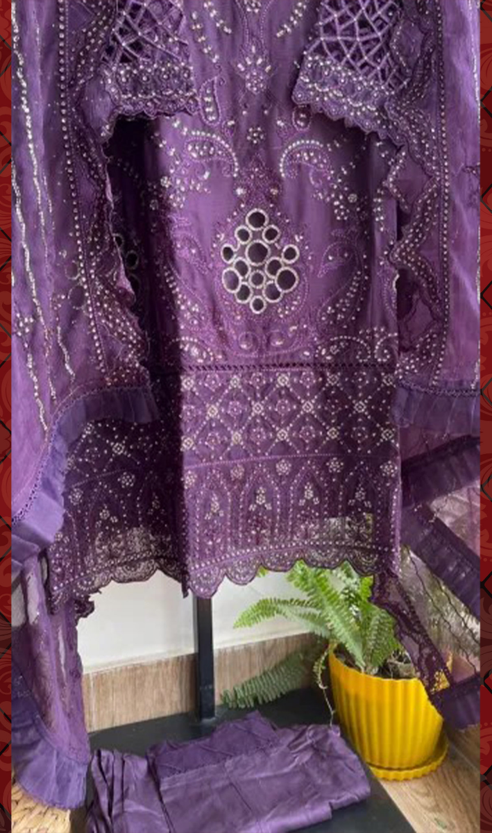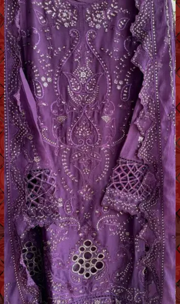 Pakistani Original Bin Saeed Luxury Chiffon stitched 3 Pcs, Embroidered Shirt With Sequin, Cutwork, Lasework & Embroidered Chiffon Dupatta With Sequin & Embroidered Borders On Sleeve With Sequin & Silk Pant