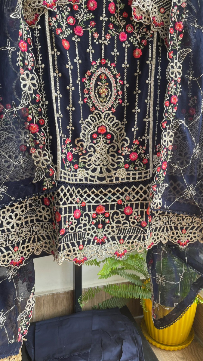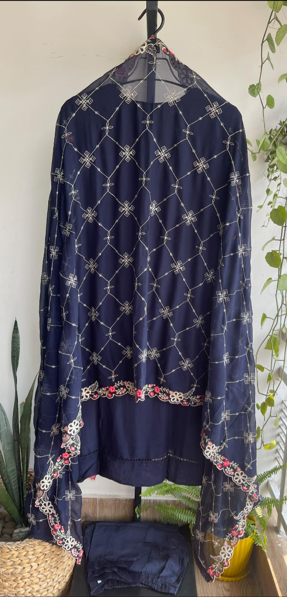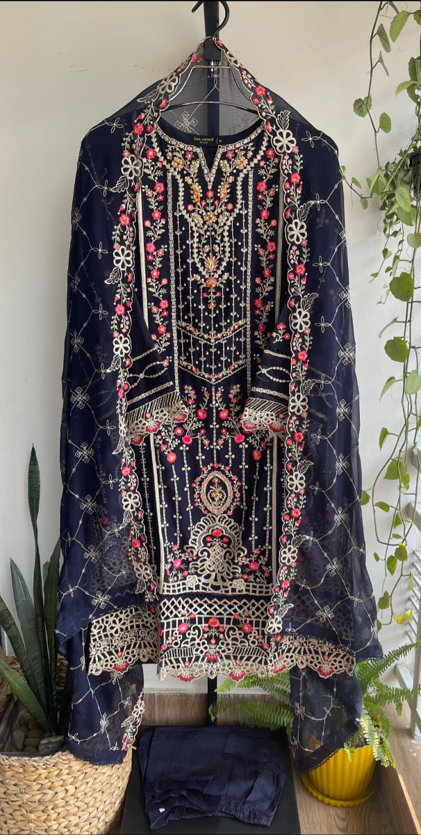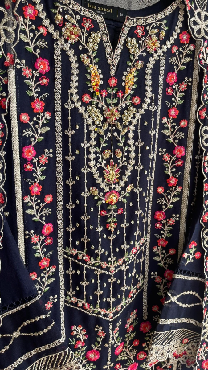 Pakistani Original Bin Saeed Luxury Chiffon stitched 3 Pcs, Embroidered Shirt With Sequin, Cutwork, Lasework & Embroidered Chiffon Dupatta With Sequin & Embroidered Borders On Sleeve With Sequin & Silk Pant