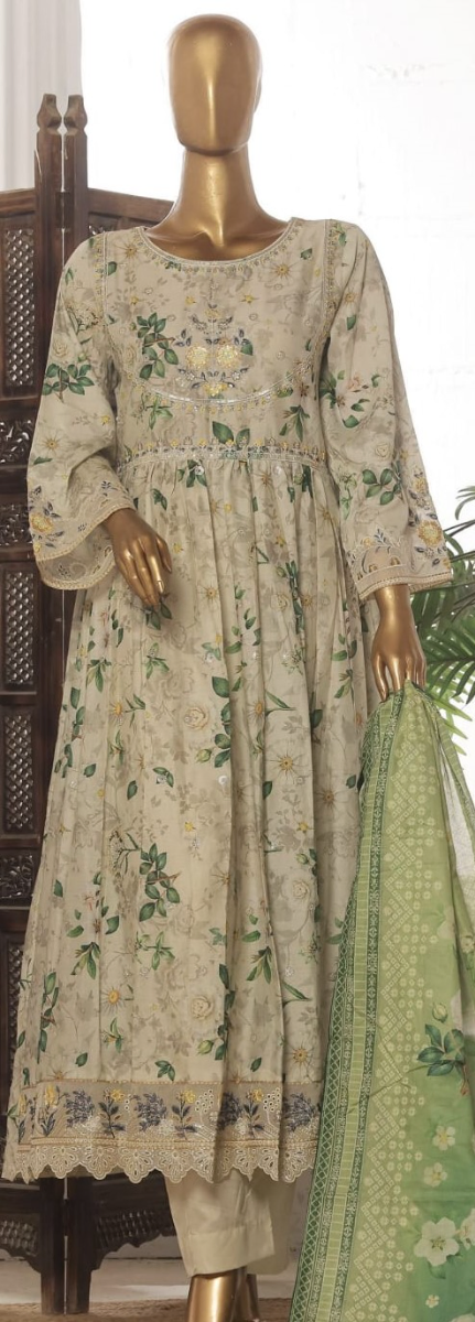 Pakistani Original Bin Saeed luxury Stitched Cotton Embroidered Gown 3 Pcs,