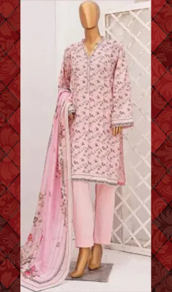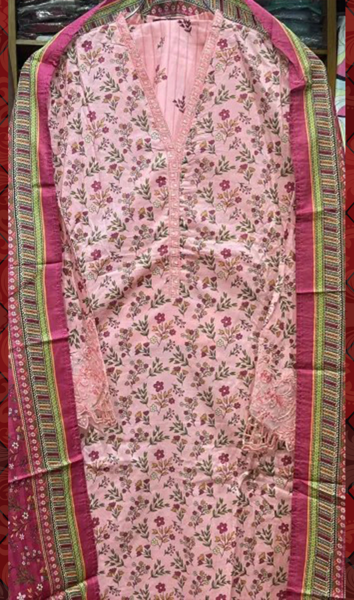 Pakistani Original Bin saeed Stitched Cotton 3pcs, Printed Shirt With Lace work & Borders On Sleeves & Cotton Pant With Printed Dupatta.