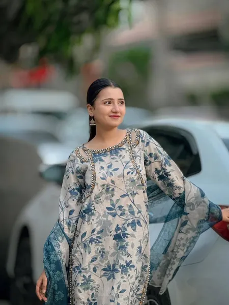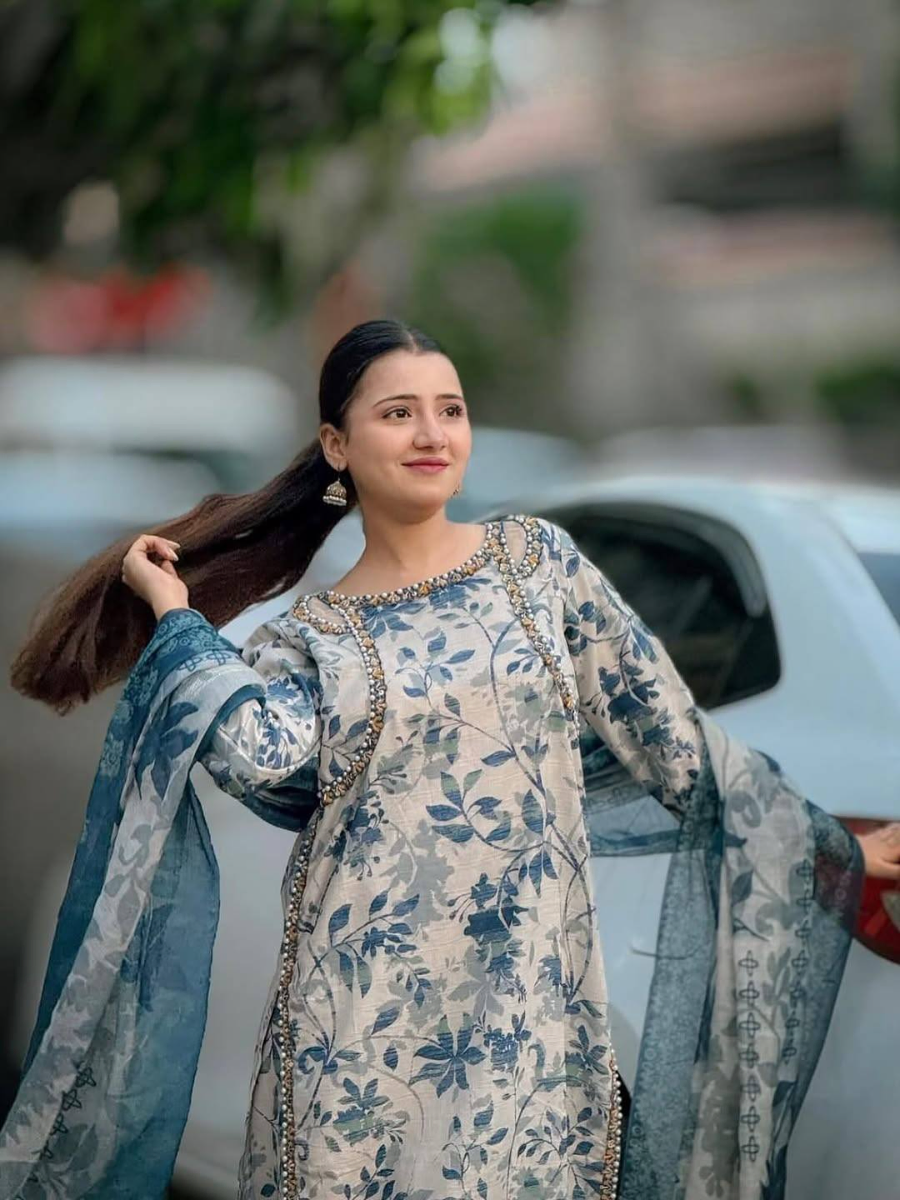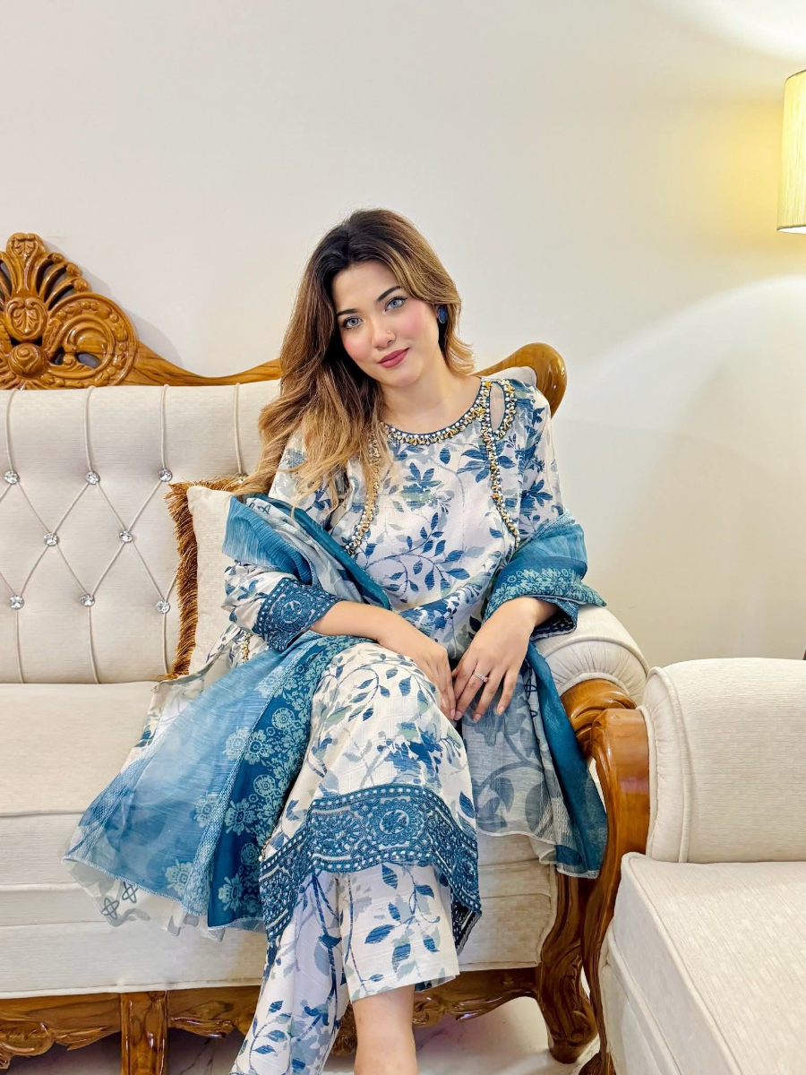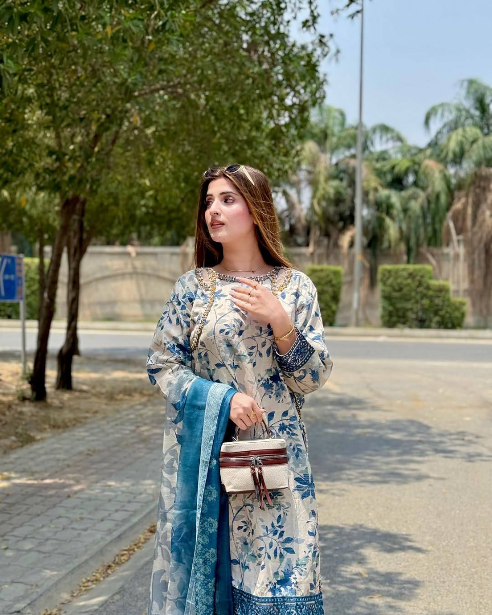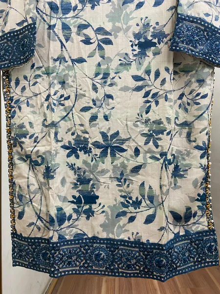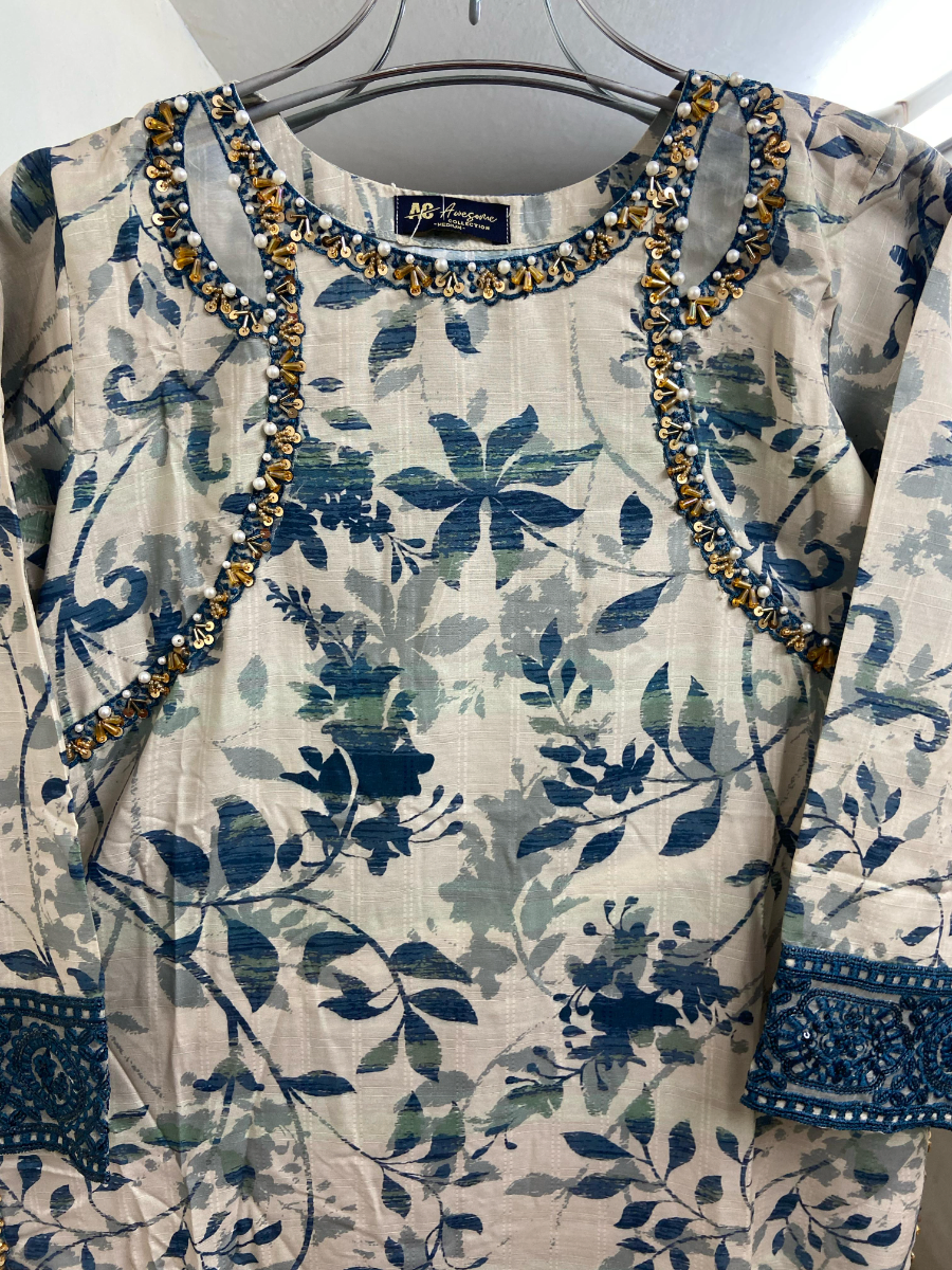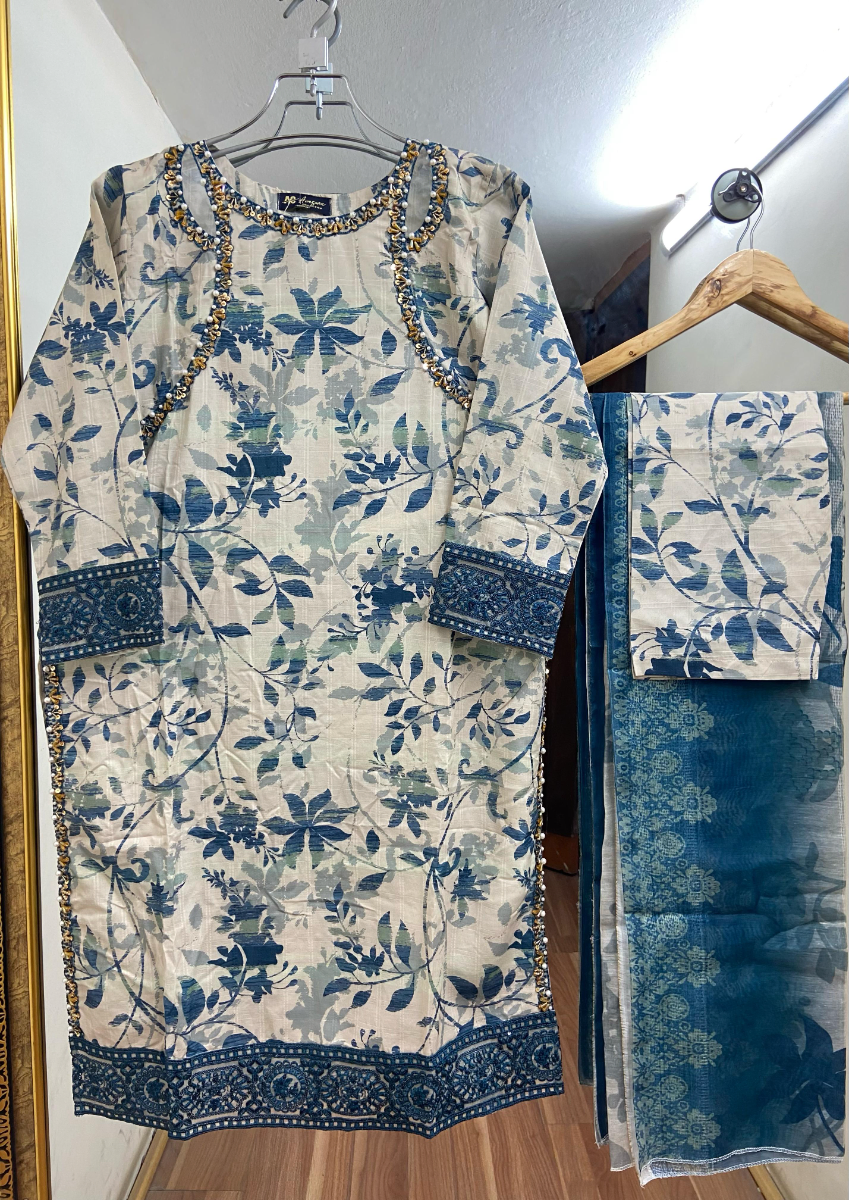 Pakistani Original Cotton Lawn Embroidered Stitched 3Pcs with Cotton Lawn Embroidered Printed Shirt With Parl , Sequin, Pipe Work & Printed Cotton Lawn Dupatta & Full Printed & Embroidered Work Borders On Sleeve With Cotton Pant
