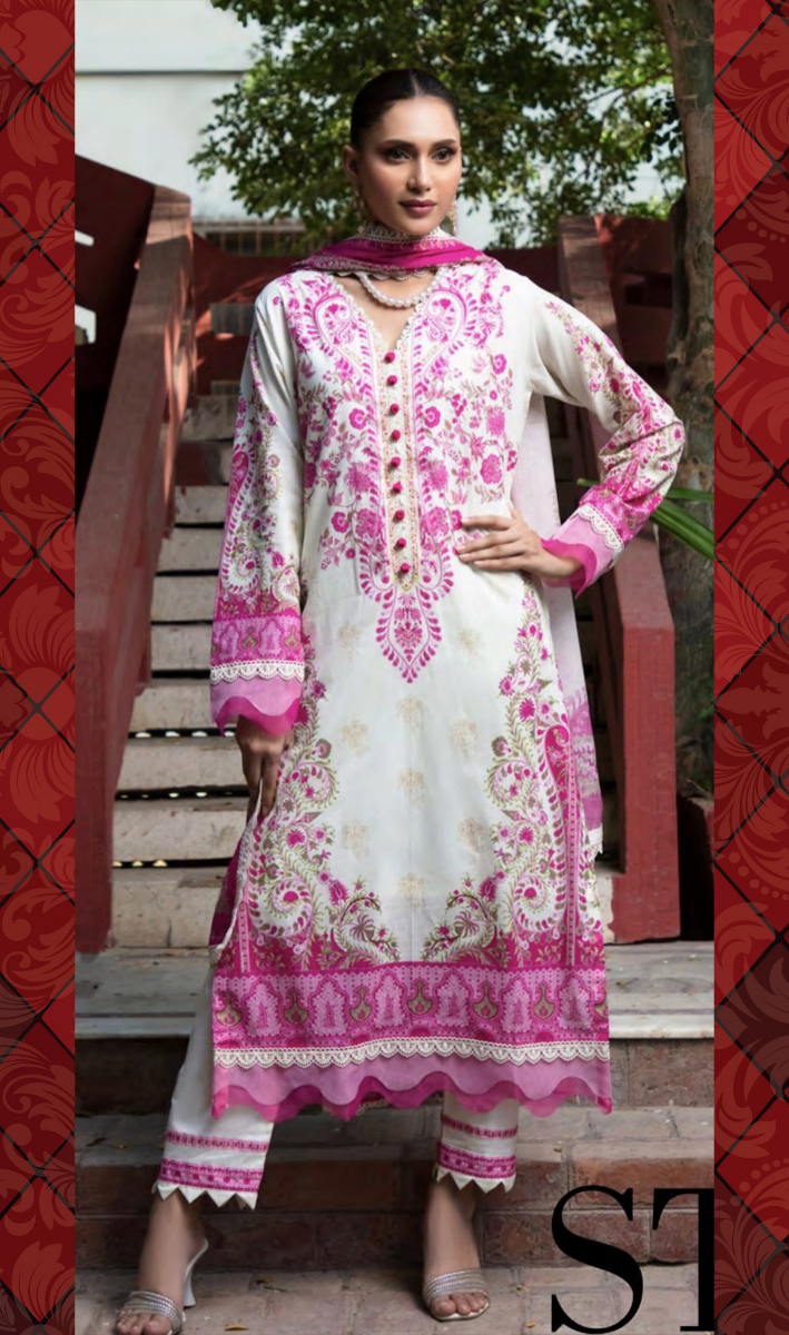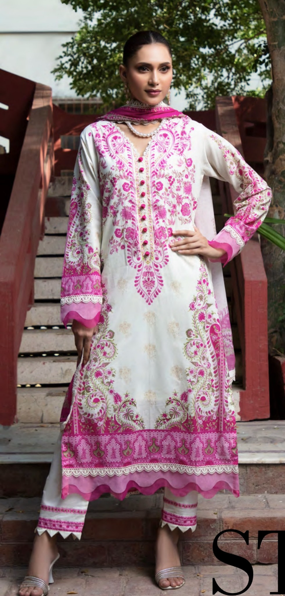 Pakistani Original Guladhar Premium Cambric Cotton Stitched 3pcs, Full Printed Shirt With Lacework, Bottom, Neckline Lacework & Full Printed Borders On Sleeves & Printed Cotton Dupatta & Cotton Pant