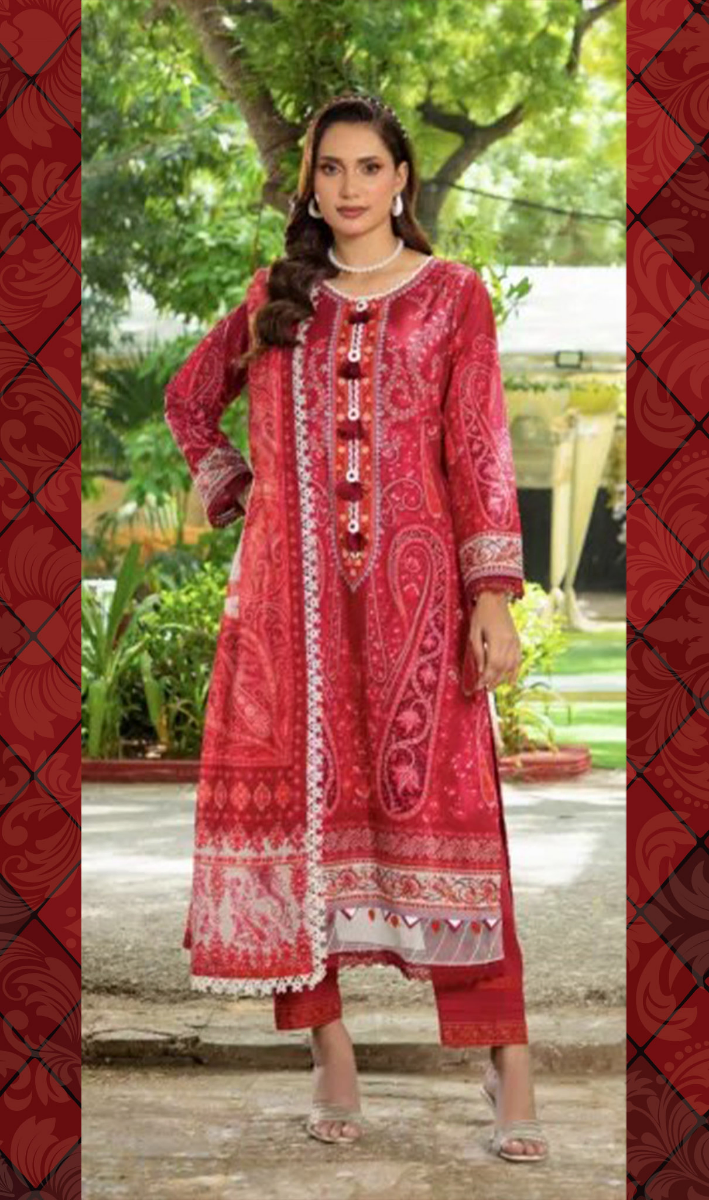 Pakistani Original Guladhar Premium Cambric Cotton Stitched 3pcs, Full Printed Shirt With Tassel Work, Lacework, Parl, Neckline Lacework & Full Printed Borders On Sleeves & Printed Cotton Dupatta & Cotton Pant
