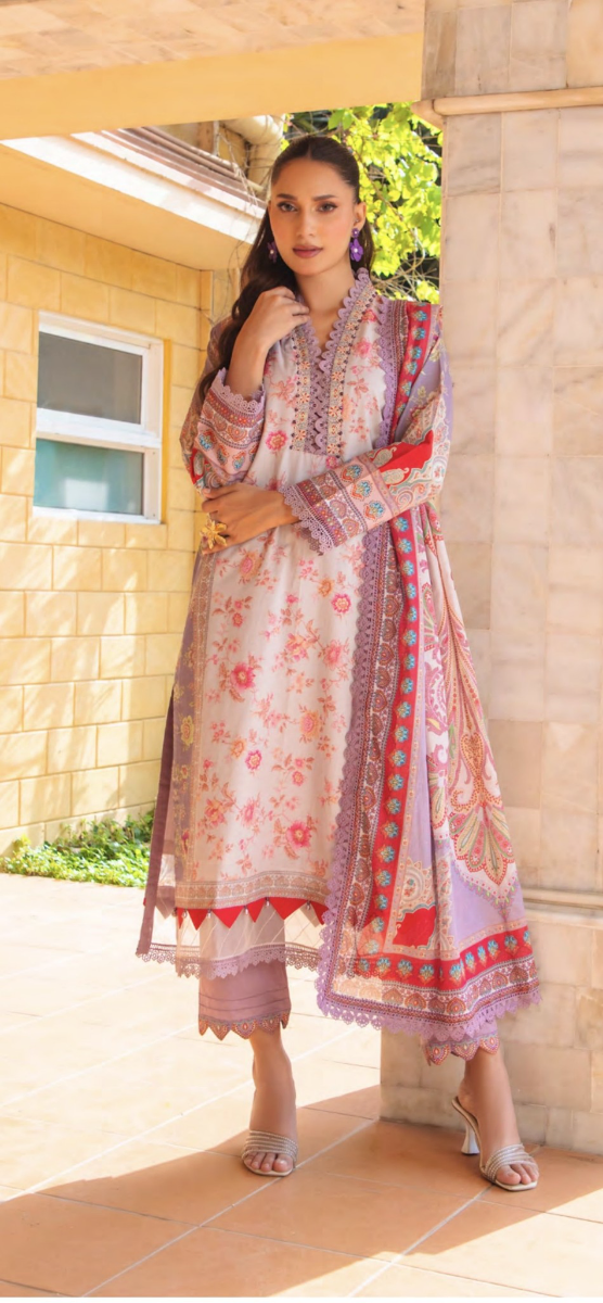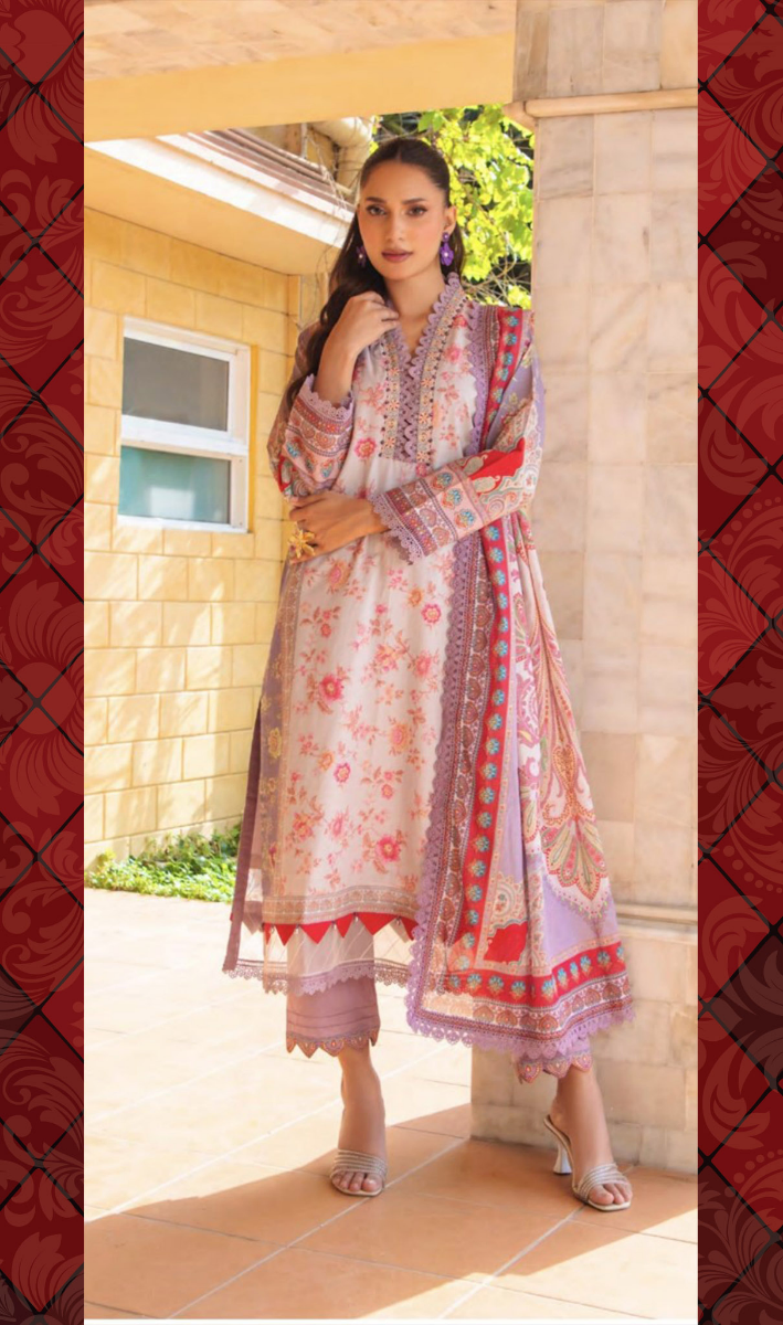 Pakistani Original Guladhar Premium Cambric Cotton Stitched 3pcs, Full Printed Shirt With Lacework, Stone, Neckline Lacework & Full Printed Borders On Sleeves & Printed Cotton Dupatta & Cotton Pant