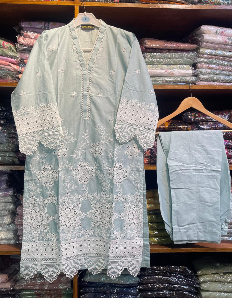 Pakistani Original Hayat's Cotton Embroidered Stitched 2Pcs, Embroidered Full Shirt With Sequin work, Naceline Lacework & Embroidered Borders On Sleeves & Cotton Pant