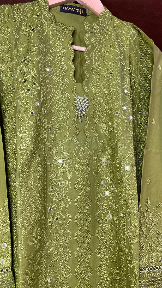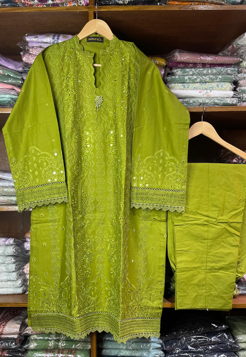 Pakistani Original Hayat's Cotton Embroidered Stitched 2Pcs, Embroidered Shirt With Button, Tassel Work, Dollar work, Lacework & Embroidered Borders On Sleeves & Cotton Pant