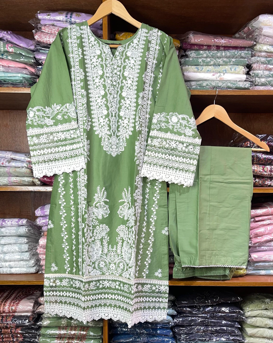 Pakistani Original Hayat's Cotton Embroidered Stitched 2Pcs, Embroidered Full Shirt With Sequin work, Lacework & Embroidered Borders On Sleeves & Cotton Pant