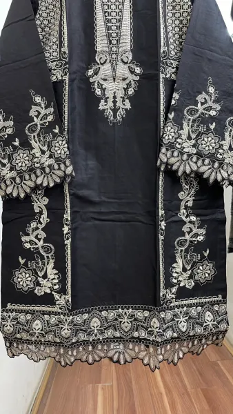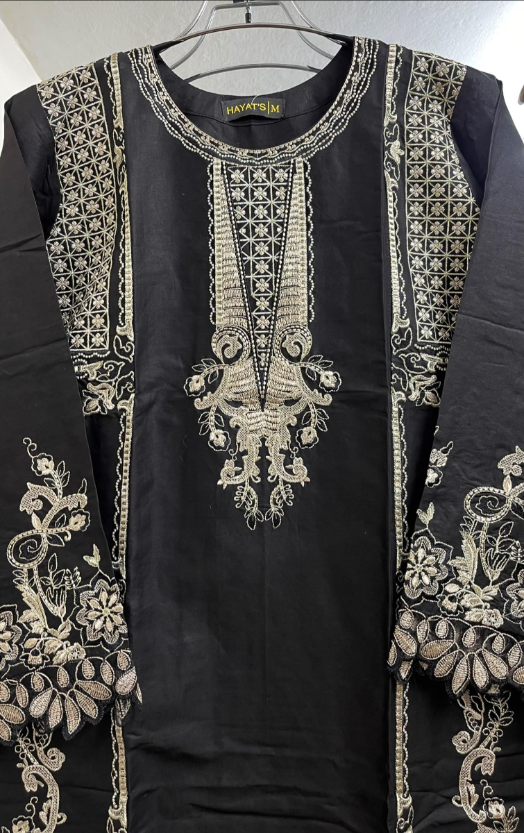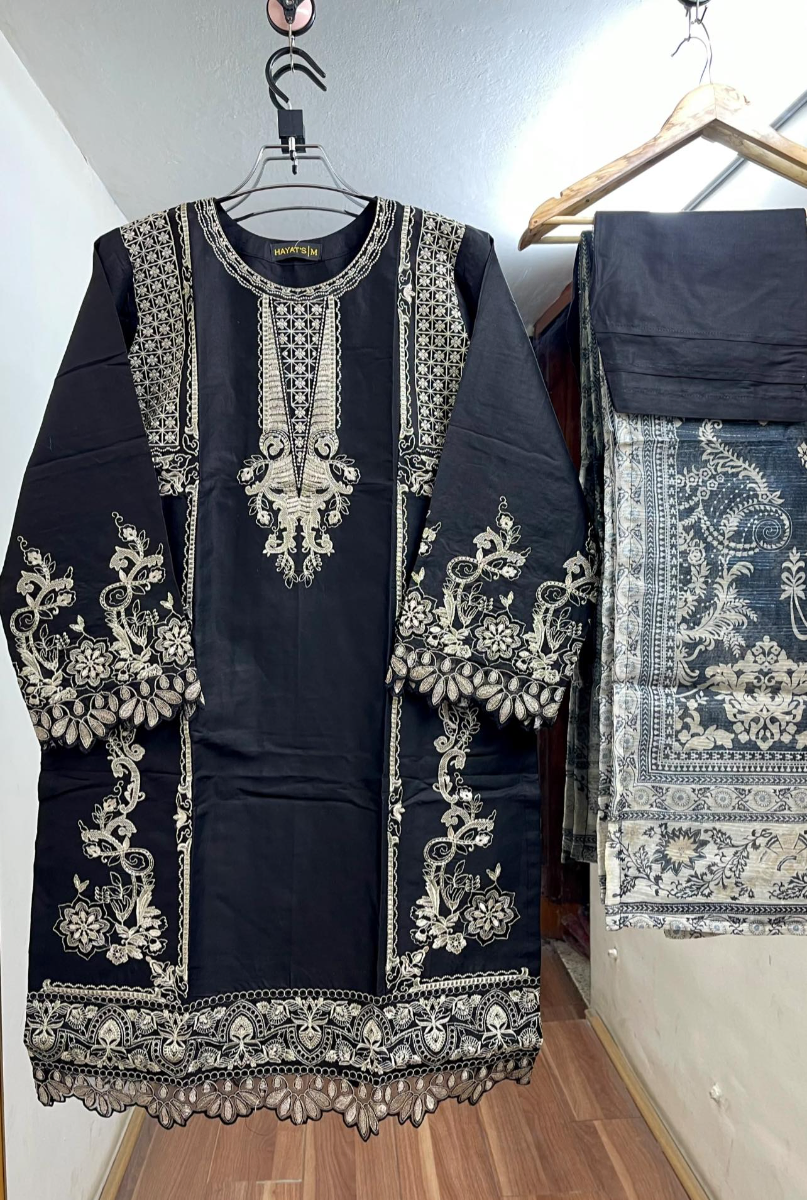 Pakistani Original Hayat’s Embroidered Stitched Cotton 3Pcs, Embroidered Shirt With Embroidered work & Embroidered Borders On Sleeves & Printed Moysorii Cotton Dupatta & Cotton Pant